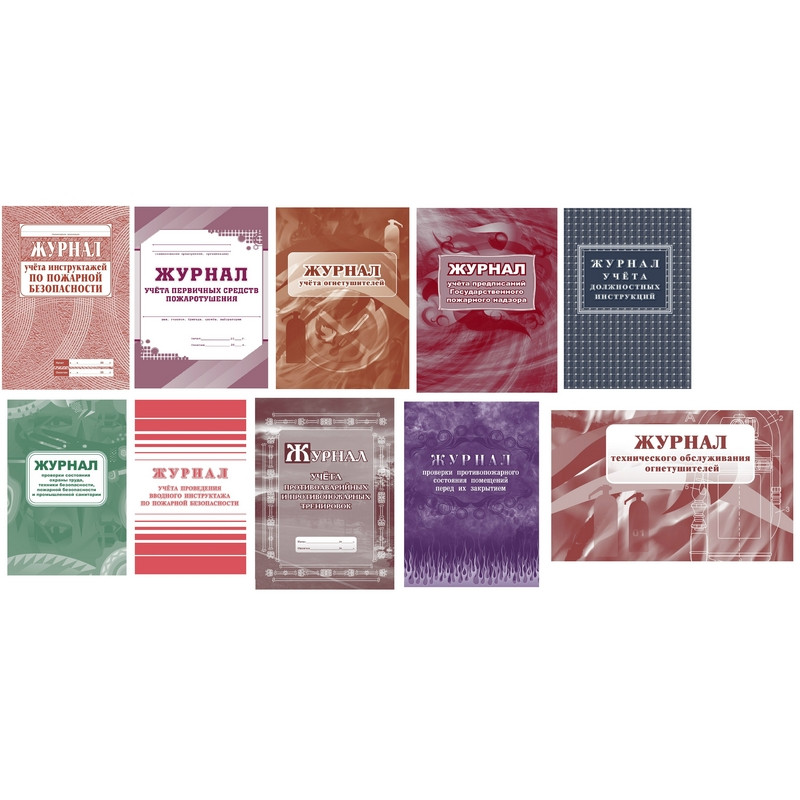Состав комплекта: - журнал учета инструктажа по пожарной безопасности. Формат А4. Обложка выполнена из офсета плотностью 160 г/кв.м. Блок состоит из газетной бумаги плотностью 45 г/кв.м. Содержит 34 листа; - журнал учета первичных средств пожаротушения. Формат А4. Обложка выполнена из офсета плотностью 160 г/кв.м. Блок состоит из газетной бумаги плотностью 45 г/кв.м. Содержит 32 листа; - журнал технического обслуживания огнетушителей. Формат А4. Альбомный спуск. Обложка выполнена из мелованного картона плотностью 200 г/кв.м. Блок состоит из писчей бумаги плотностью 60 г/кв.м. Содержит 28 листов; - журнал учета огнетушителей. Формат А4. Обложка выполнена из офсета плотностью 160 г/кв.м. Блок состоит из писчей бумаги плотностью 60 г/кв.м. Содержит 12 листа; - журнал учета противоаварийных и противопожарных тренировок. Формат А4. Обложка выполнена из мелованного картона. Блок состоит из писчей бумаги. Содержит 24 листа; - журнал учета предписаний Государственного пожарного надзора. Формат А4. Обложка выполнена из офсета плотностью 160 г/кв.м. Блок состоит из писчей бумаги плотностью 60 г/кв.м. Содержит 12 листа; - журнал проверки противопожарного состояния помещений перед их закрытием. Формат А4. Обложка выполнена из офсета плотностью 160 г/кв.м. Блок состоит из писчей бумаги плотностью 60 г/кв.м. Содержит 32 листа; - журнал проверки состояния охраны труда, техники безопасности, пожарной безопасности и промышленной санитарии. Формат А4. Обложка выполнена из офсета плотностью 160 г/кв.м. Блок состоит из писчей бумаги плотностью 60 г/кв.м. Содержит 32 листа; - журнал учета проведения вводного инструктажа по пожарной безопасности. Формат А4. Обложка выполнена из офсета плотностью 160 г/кв.м. Блок состоит из писчей бумаги плотностью 60 г/кв.м. Содержит 32 листа; - журнал учета должностных инструкций. Формат А4. Обложка выполнена из офсета плотностью 160 г/кв.м. Блок состоит из писчей бумаги плотностью 60 г/кв.м. Содержит 16 листов.