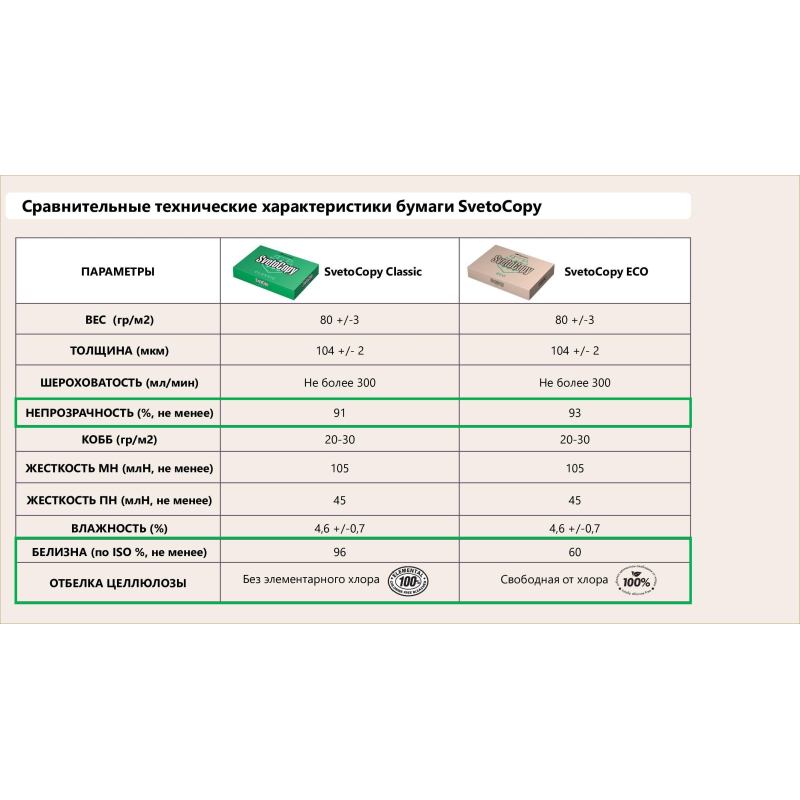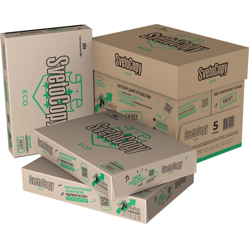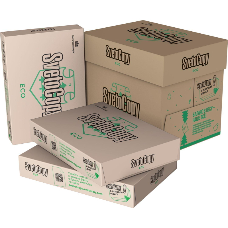 МАРКА № 1 В РОССИИ 2024 в категории 'Офисная бумага'. SvetoCopy ECO - универсальная офисная бумага из полубеленой целлюлозы предназначена для работы в принтерах и копировальных аппаратах.Офисная бумага SvetoCopy ECO относится к марке 'Сэ', сертифицирована по ГОСТ Р 57641-2017. Граммаж составляет 80 г/м², толщина - 104 микрон. При отбелке целлюлозы не используется хлор.Бежевый цвет SvetoCopy ECO достигается благодаря применению меньшего количества отбеливающих веществ. Уровня белизны 60% (ISO) достаточно для выполнения функции носителя информации. Высокий показатель непрозрачности обеспечивает хорошую читаемость текста при двусторонней печати. Оптимальное сочетание показателей жесткости, шероховатости и других характеристик обеспечивает стабильно высокое качество цветной и черно-белой печати. Уникальная технология производства офисной бумаги SvetoCopy ECO позволяет добиться снижения воздействия на окружающую среду, включая сокращение углеродного следа и выбросов в атмосферу. Бумага SvetoCopy ECO производится из древесины, полученной из ответственно управляемых лесов и сертифицирована по системе 'Лесной эталон'.Страна-производитель - Россия.Запомните три простых правила: 1. Хранить бумагу в сухом месте.2. Распушить стопку бумаги перед загрузкой в принтер.3. Открывать пачку бумаги непосредственно перед использованием.Законодательные и технические документы