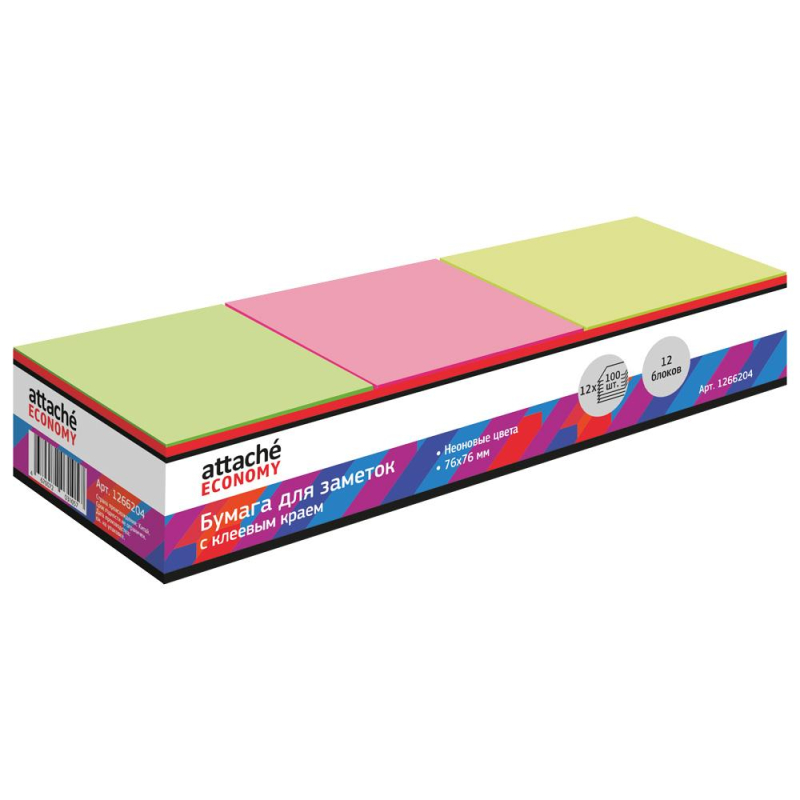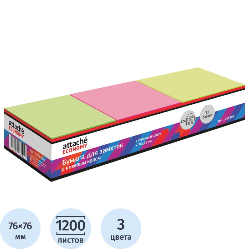 Стикеры Attache Economy в формате 76x76 мм, в упаковке 12 блоков по 100 листов (всего 1200 листов). Идеально подойдут для сотрудников творческих профессий и руководителей: рекомендуется для использования в процессе совещаний, обучения, мозговых штурмов. Плотность бумаги составляет 75 г/кв.м, клейкий слой - 16 Н/м. Длина клейкой стороны 76 мм. В упаковку входят стикеры 3 неоновых цветов: розового, желтого, зеленого. Особых условий хранения не требует, сертификации не подлежит, срок годности не ограничен. Чтобы увеличить срок службы стикеров, пожалуйста, следуйте рекомендациям: 1) Отделять стикер от блока следует вдоль клеевой полосы. Так можно избежать скручивания и последующего отклеивания стикера. 2) Прежде чем наклеивать стикер, убедитесь в отсутствии грязи и пыли на поверхности. На чистой поверхности срок службы клеевого слоя более продолжителен.