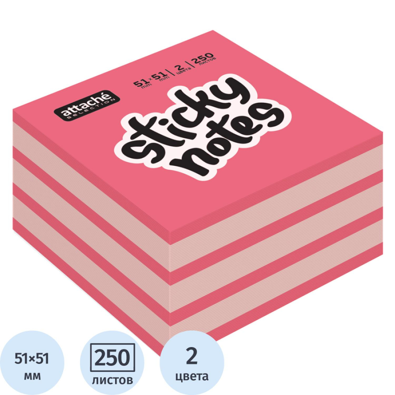 Стикеры Attache Selection Мини куб в формате 51x51 мм, состоят из 250 листов упакованных в пленку. Стикеры из 2 цветов (розовый, светло-розовый). Идеально подойдут для сотрудников творческих профессий и руководителей: рекомендуются для использования в процессе совещаний, обучения, мозговых штурмов. Тон стикеров - пастельный и неоновый. Плотность бумаги: 75 г/кв.м. Клейкий слой - 22 Н/м. Длина клейкой стороны 51 мм. Особых условий хранения не требует, сертификации не подлежит, срок годности не ограничен. Чтобы увеличить срок службы стикеров, пожалуйста, следуйте рекомендациям: 1) Отделять стикер от блока следует вдоль клеевой полосы. Так можно избежать скручивания и последующего отклеивания стикера. 2) Прежде чем наклеивать стикер, убедитесь в отсутствии грязи и пыли на поверхности. На чистой поверхности срок службы клеевого слоя более продолжителен.