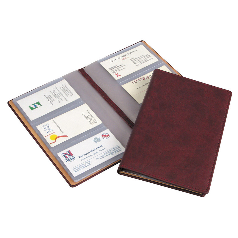 Вертикальная трехрядная визитница Attache из коллекции 'Вива' изготовлена из искусственной кожи с защитным покрытием, бордового цвета, размер - 133x202 мм. Имеет внутренний блок на 72 визитки. Карманы для визиток изготовлены из прозрачного полипропилена. На обложку визитницы можно нанести логотип любым способом тиснения. Каждое отделение предполагает возможность хранения 2-х визиток.
