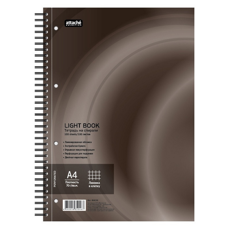 LightBook - современные бизнес-тетради формата А4 для офиса и учебных заведений. Обложки с привлекательным дизайном изготовлены из ламинированного картона. Плотность обложки - 200 г/м. В тетрадных блоках применена микроперфорация для ровного и удобного отрывания листов. В тетрадях формата А4 при этом присутствует перфорация для подшивки вырваных листов в любую папку. Блок включает 100 листов высококачественной офсетной бумаги 70 г/кв.м, тип крепления - двойная спираль. Листы в клетку 100% белизны. Размер блока - 205x297 мм. Необходимо придерживать лист в месте перфорации, чтобы он не вырвался полностью по спирали.