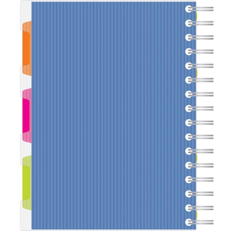 Бизнес-тетрадь Spiral Book формата А5, 140 листов. Обложка с вырубкой из жесткого экологичного прозрачного пластика с волнистым рельефом, двойная толстая евроспираль, увеличенного диаметра. Пластиковые съемные разделители. Первый лист из плотной бумаги с запечаткой, разлиновка в клетку с аккуратными полями. Синий Дизайн. Размер - 147x204 мм.