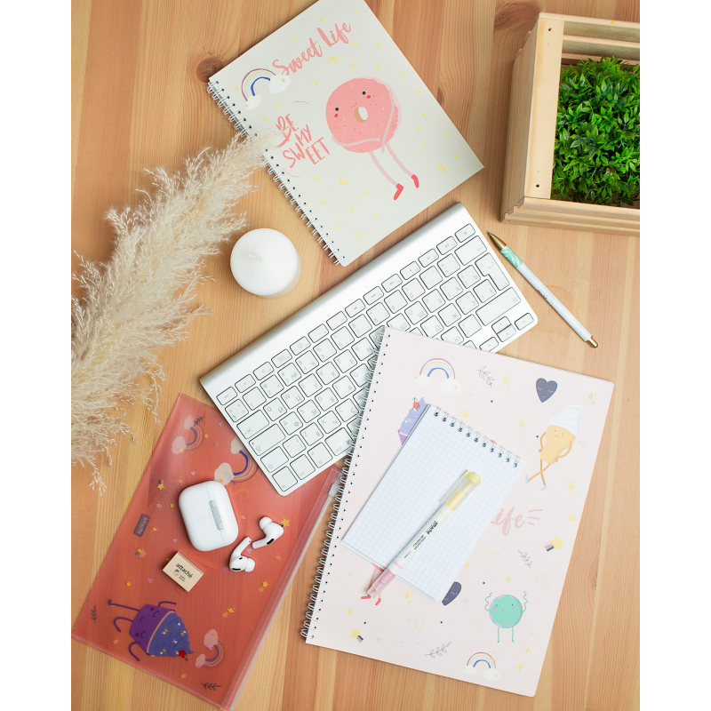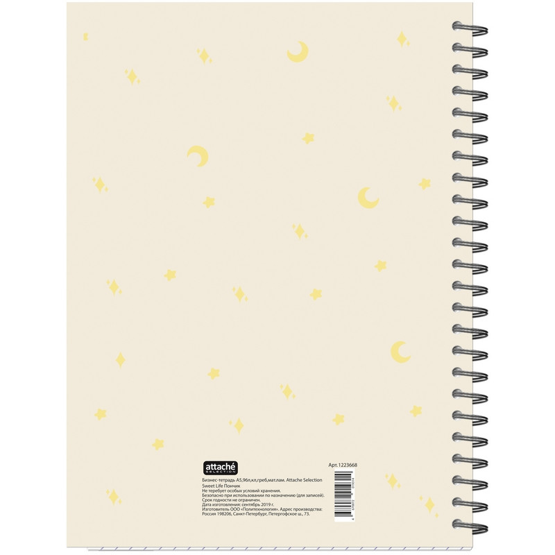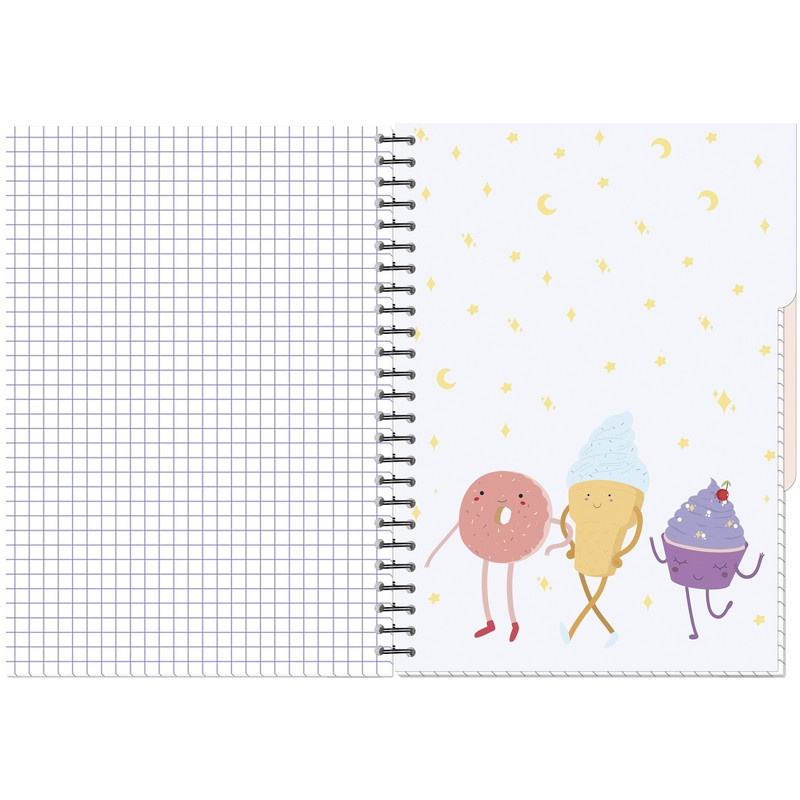 Тетрадь общая Attache Selection Sweet Life "Пончик" А5 на спирали (металлическом гребне) в двумя картонными разделителями - предназначена для записей, используется в старших классах, студентами и в офисе. Обложка изготовлена из картона с цветной печатью и матовой ламинацией, плотность 230 г/кв.м. Внутренний блок - белая бумага, офсетная 60 г/кв.м, белизна - 100%. Тетрадь толщиной 96 листов в клетку. Размер тетради - 145х203 мм. В тетради - два разделителя из картона 230 г/кв.м, с матовой ламинацией, делят тетрадь на три блока по 32 листа.
