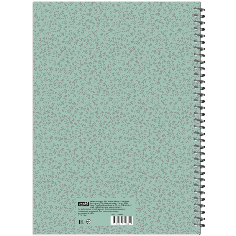 Бизнес-тетрадь Attache Fleur Мята формата А4 на спирали (металлическом гребне) предназначена для записей. Обложка изготовлена из картона с цветной печатью и матовой ламинацией, плотность 230 г/кв.м. Внутренний блок - белая бумага, офсетная 60 г/кв.м, белизна - 100%. Тетрадь состоит из 96 листов с линовкой "в точку". Размер тетради - 203х290 мм.
