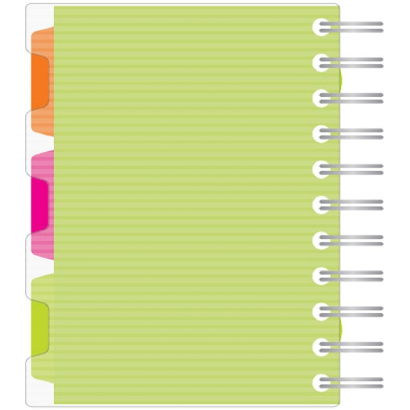 Бизнес-тетрадь Spiral Book формата А6, 140 листов. Обложка с вырубкой из жесткого экологичного прозрачного пластика с волнистым рельефом, двойная толстая евроспираль, увеличенного диаметра. Пластиковые съемные разделители. Первый лист из плотной бумаги с запечаткой, разлиновка в клетку с аккуратными полями. Салатовый Дизайн. Размер блока - 102x142 мм.