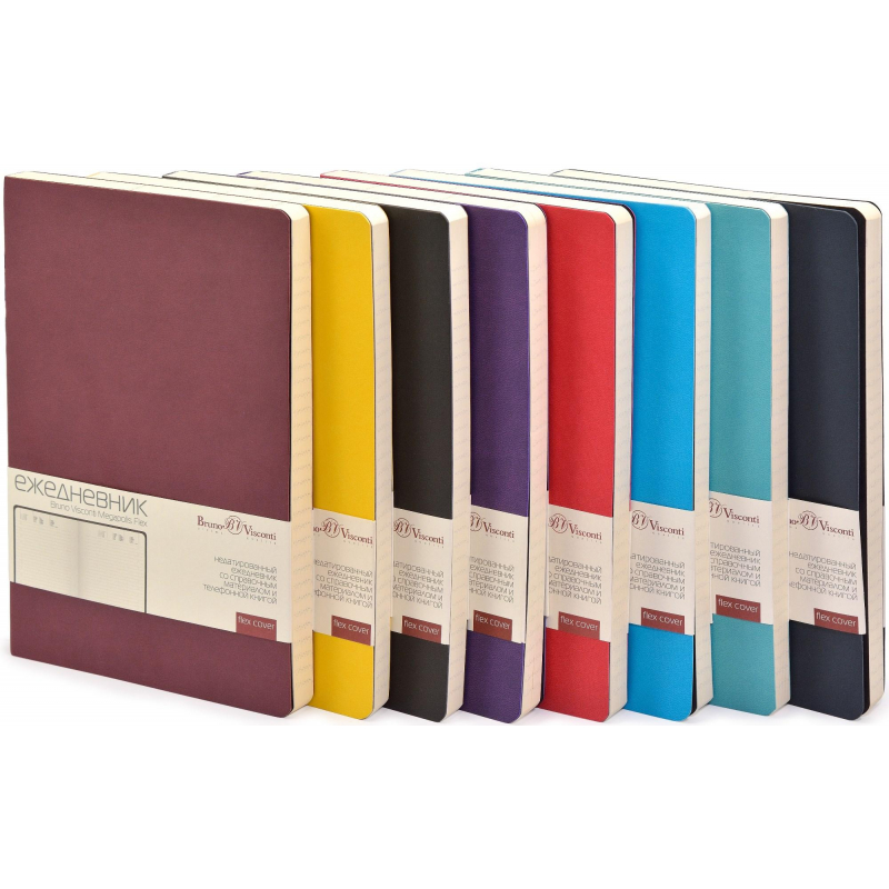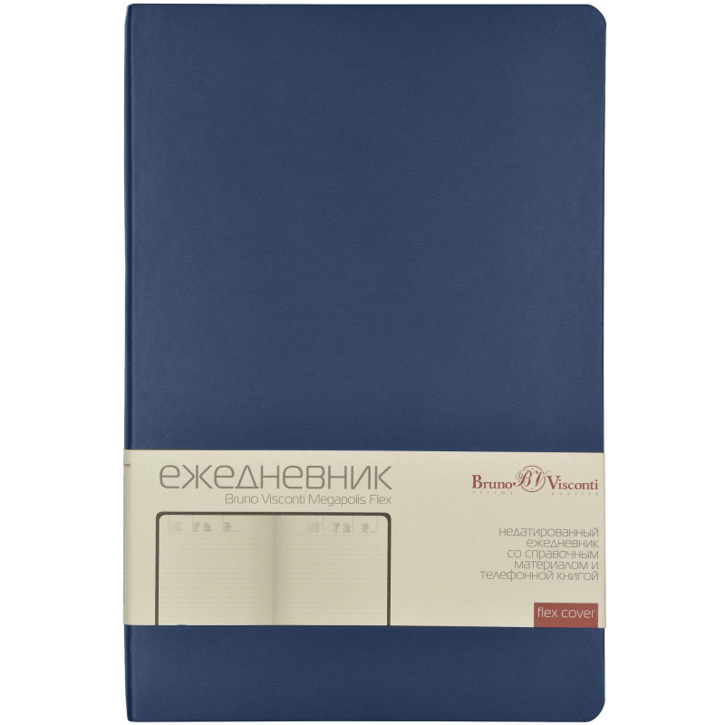 Ежедневник недатированный Bruno Visconti Megapolis Flex. Элегантная закругленная flex обложка из гладкого кожзама имеет гибкую конструкцию. Интегральный переплет позволяет сэкономить место с рабочей сумке или портфеле - ежедневник можно просто свернуть в трубку или согнуть пополам. Недатированный ежедневник формата А5 (14x21 см) содержит 272 страницы. Для ниx используется качественный бежевый офсет повышенной плотности (70-90 г/кв.м.). Блок не привязан к конкретным датам - они указываются в выделенном поле вверxу страницы. Тонированная бумага не дает глазам утомиться даже при длительной работе. Ежедневник также содержит справочную информацию и телефонную книгу. Предлагаем услуги по нанесению логотипа на обложку.
