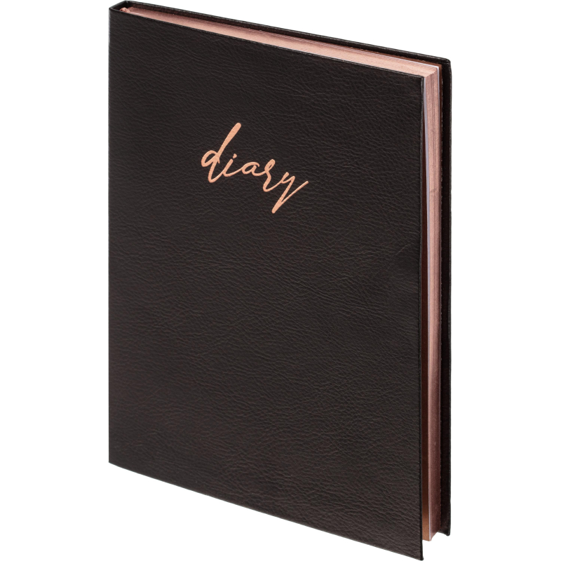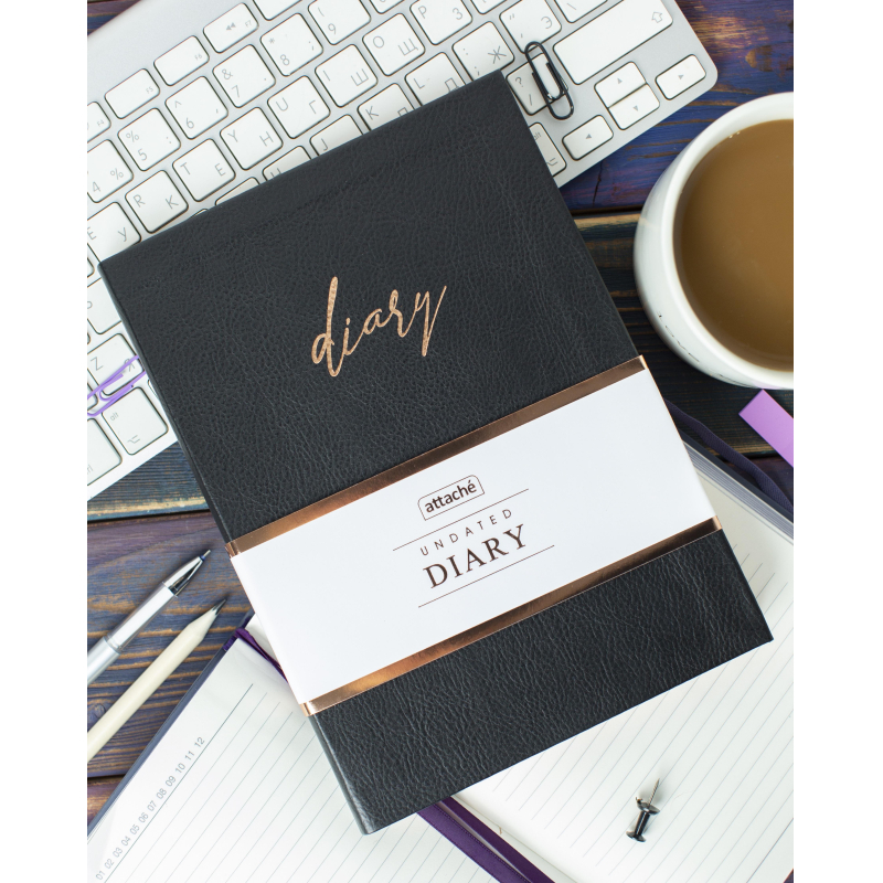 Ежедневник недатированный Attache, черный. Формат - А5, размер изделия 140x200 мм. Однотонная мягкая обложка из искусственной кожи. Материал фактурный. Возможно нанесение логотипа на обложку, любым способом тиснения (блинт, фольга). Срез: золотистый (розовое золото). Блок: недатированный, 136 листов (272 страницы), офсет 70 г/кв.м, в 2 краски (линейка), ляссе коричневого цвета. Форзац/нахзац: 180 г/кв.м, коричневого цвета. Содержитинформационно-справочный блок - личные данные, календарь на 2024 - 2027 гг., карта часовых поясов, единицы измерения, международные форматы бумаги, телефонные коды крупных городов России, телефонные коды стран и городов мира, международные размеры одежды и обуви, знаки зодиака, питание и расход калорий, телефоны первой необходимости в Москве, автомобильные коды регионов России.