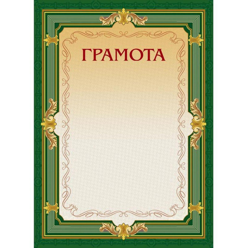 Формат: 210x290 мм. Картон полиграфический мелованный, плотностью 230 г/кв.м. Зеленая рамка , светло-бежевый фон, слово 'Грамота' - красная фольга с конгревом (без герба).