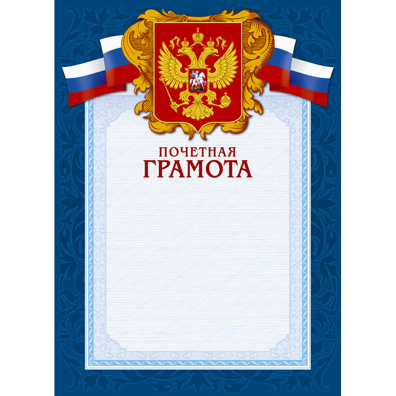 Формат: 210x290 мм. Картон полиграфический мелованный, плотностью 230 г/кв.м. Синяя рамка , светло-голубой фон, триколор, герб - золотая фольга с конгревом, слова 'Почетная грамота' - красная фольга с конгревом.