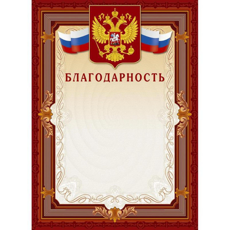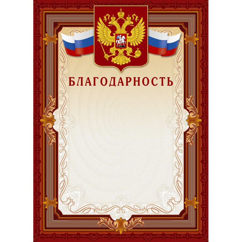 Формат: 210х290 мм. Картон полиграфический мелованный, плотностью 230 г/кв.м. Коричневая рамка, светло-бежевый фон, триколор, герб - золотая фольга с конгревом, слово 'Благодарность' - красная фольга с конгревом (без герба).