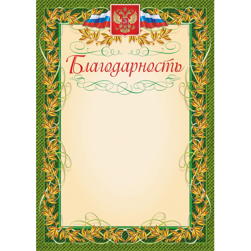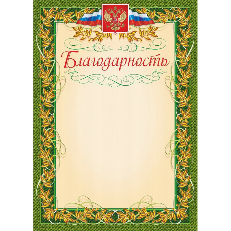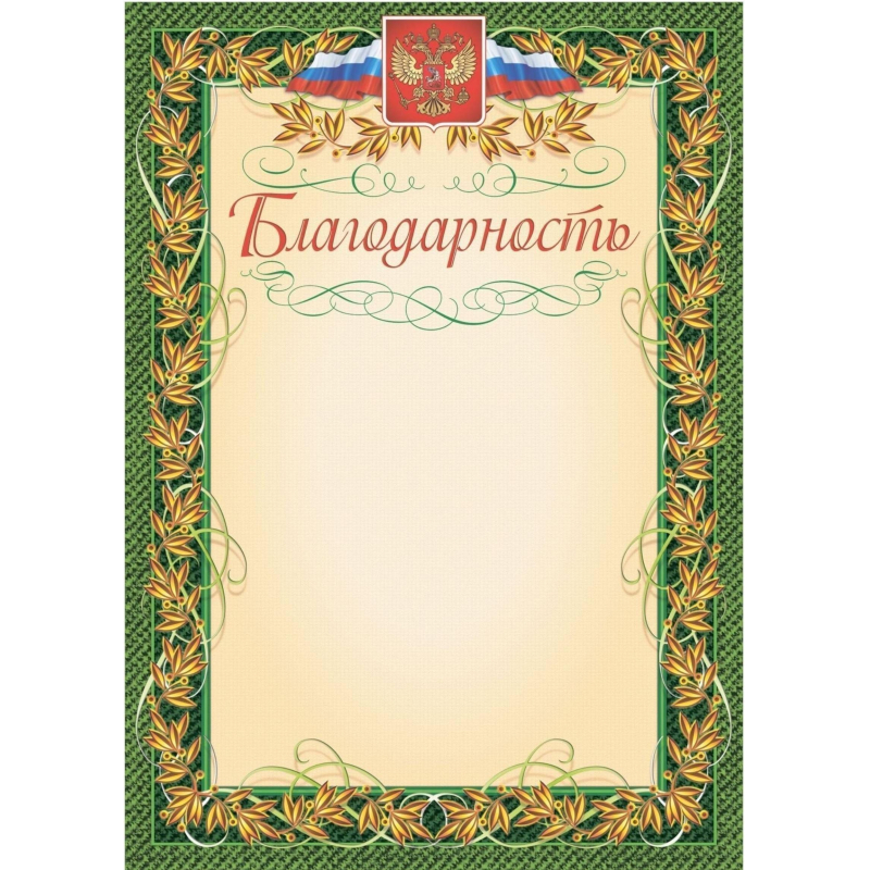 Благодарность с гербом и флагом, обрамленная рамкой с лавровым листом - наградная продукция за особые достижения. Благодарность отпечатана на мелованной бумаге. Подходит для печати текста на принтере. В одной упаковке 40 листов. Плотность - 140 г/кв.м. Формат А4.