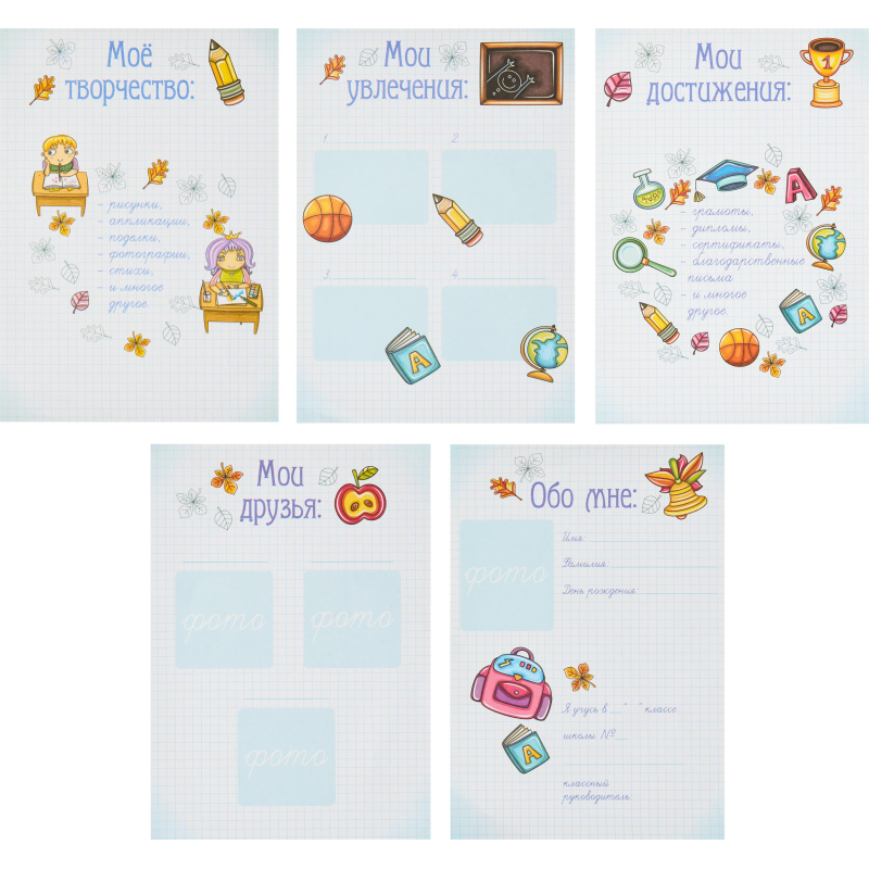 Портфолио- это портфель достижений выпускника начальной школы. Позволит собрать и систематизировать полезную информацию об учебных и внеучебных достижениях ребёнка, урочных и внеурочных результатах его деятельности. Папка включает пять файлов, в которые вложены тематические листы (разделы). Файлы крепятся на завязках (тесьма белого цвета). Количество файлов можно увеличивать и уменьшать по желанию. Ширина корешка: 25 мм. Разделы: 1. Обо мне. 2. Мои друзья. 3. Мои достижения. 4. Мои увлечения. 5. Мое творчество.
