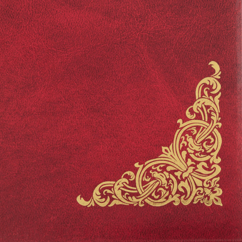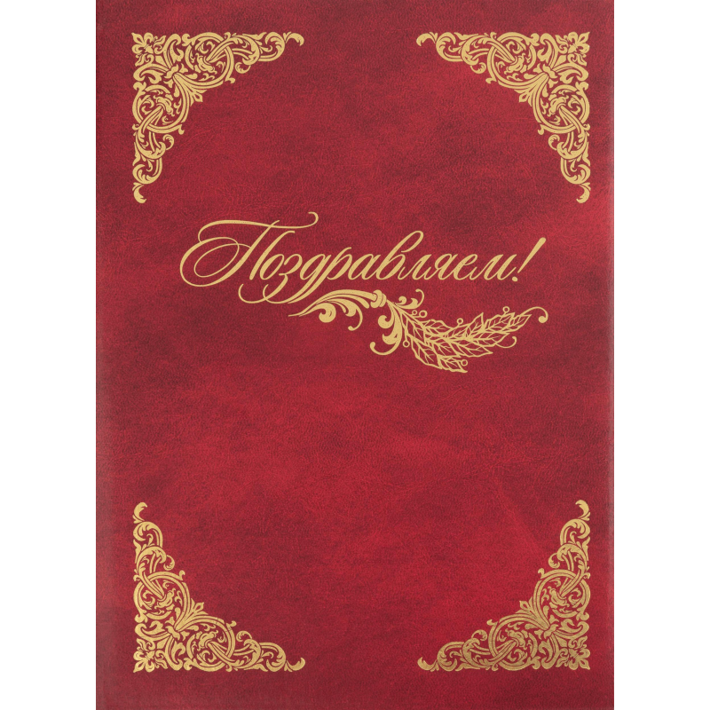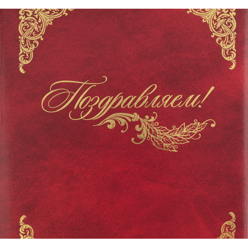Адресная папка формата А4 бордового цвета - оптимальный вариант для торжественных мероприятий, в том числе корпоративных. Материал обложки - балакрон. На лицевой стороне золотистая надпись "Поздравляем!" и декоративные виньетки по углам. Внутри бумажные вклейки. На папку можно нанести логотип.