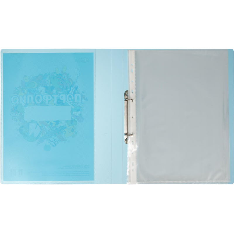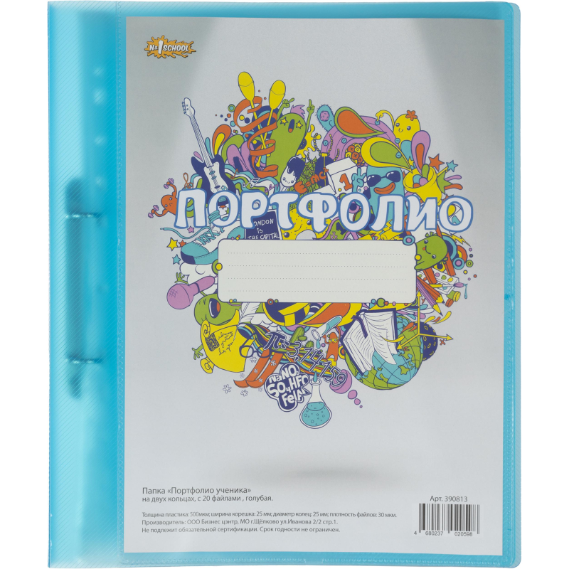 Папка-портфолио ученика, материал - высококачественный полипропилен, цвет голубой, формат А4. Снабжена механизмом на двух кольцах, благодаря которому ребенок легко сможет пополнять свой портфель достижений по мере необходимости. В папке имеются 20 файлов. Фактура пластика:<диагональ>. Фурнитура - 2 кольца, диаметр - 20мм. Есть возможность заменить картинку на обложке.