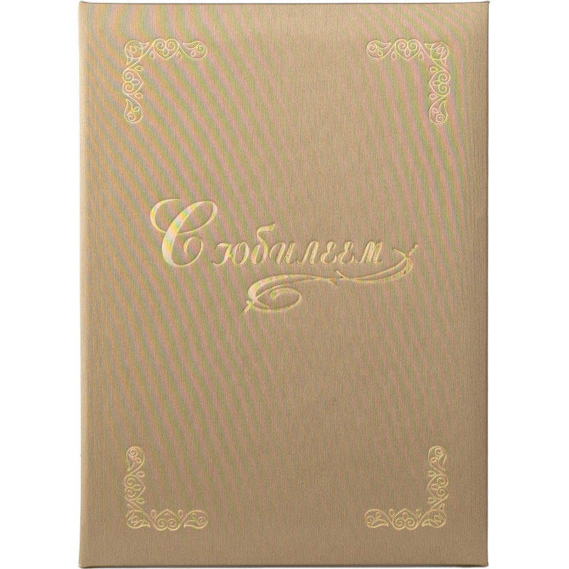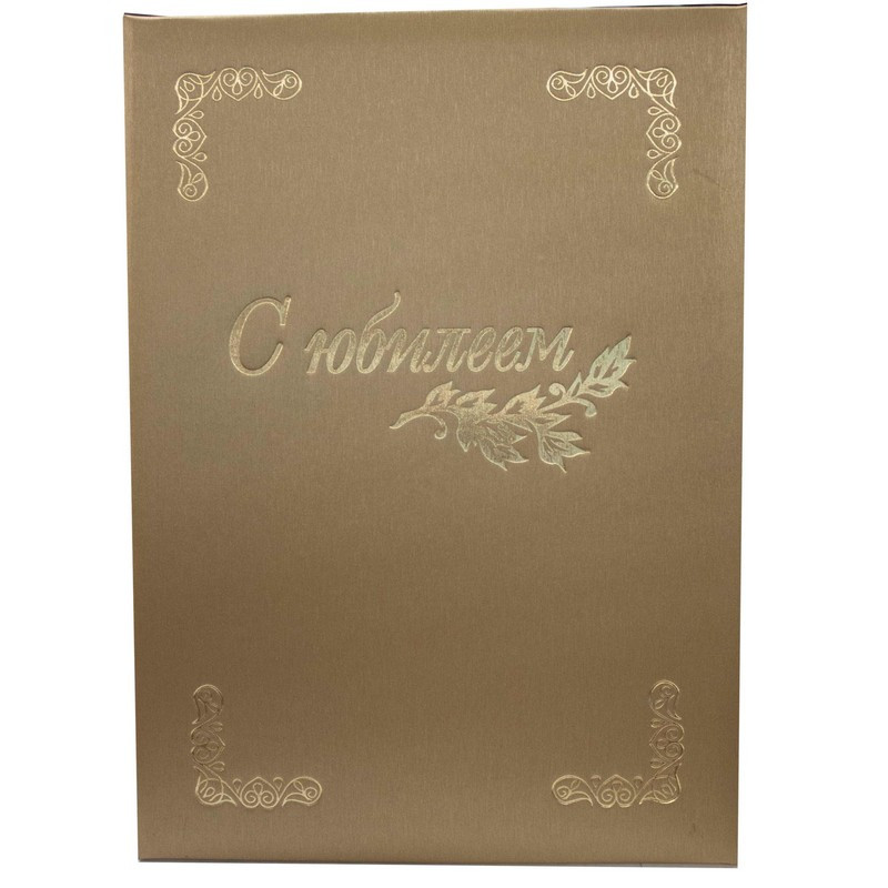 Адресная папка формата А4. Выполнена из переплетного материала танго золотого цвета (слой ПВХ на бумажной основе). Внутренние вклейки - из балакрона (ПВХ с имитацией кожи). На обложке надпись С юбилеем и орнамент (тиснение золотой фольгой). Внутри фиксирующий ремешок. Ручная сборка. На данный товар можно нанести логотип. Папка адресная - прекрасный атрибут для официальных и праздничных мероприятий.