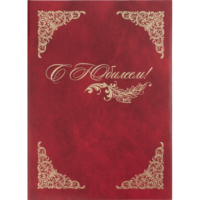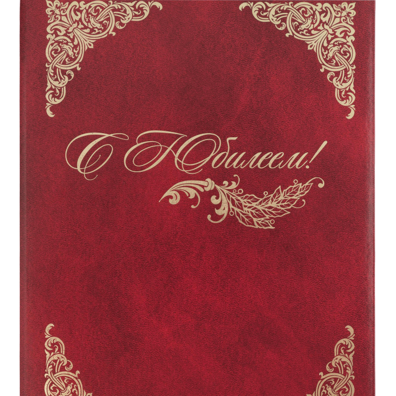 Адресная папка формата А4 изготовлена из бумвинила бордового цвета (слой ПВХ на бумажной основе). На обложку методом тиснения золотой фольгой нанесено 'С Юбилеем!' в рамке из четырех уголков. Внутри есть фиксирующая ленточка для бумаг. Адресная папка подходит для поздравлений. Папка поставляется в пакете. Страна происхождения: Россия. Формат: 310x220 мм.
