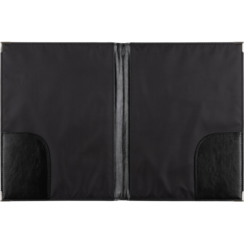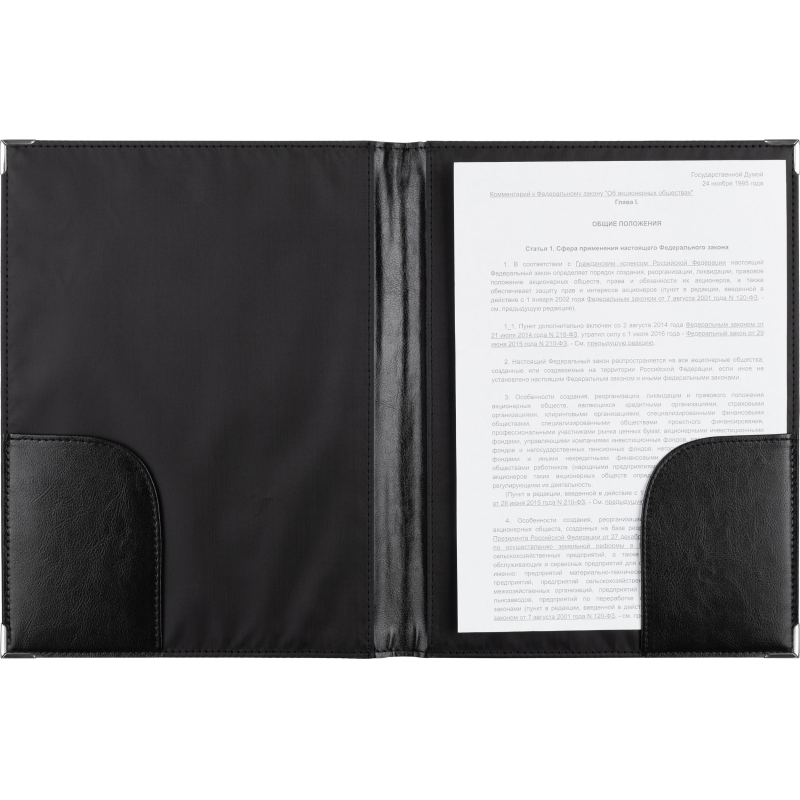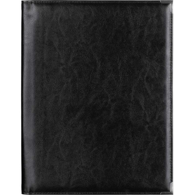 Адресная папка формата А4+. Материал - искусственная кожа. Адресная папка подходит для поздравлений, хранения документов, а также подачи их на подпись. Два угловых кармана. Металлические уголки. Цвет: черный. Корешок папки - 6 мм. Данная папка вмещает в себя до 50-60 листов плотностью 70-80 г/кв.м. На папку можно нанести логотип.