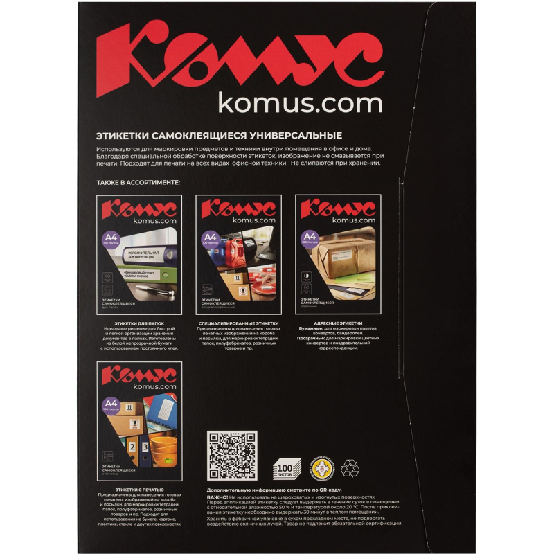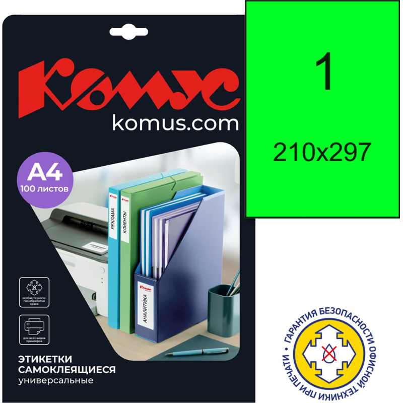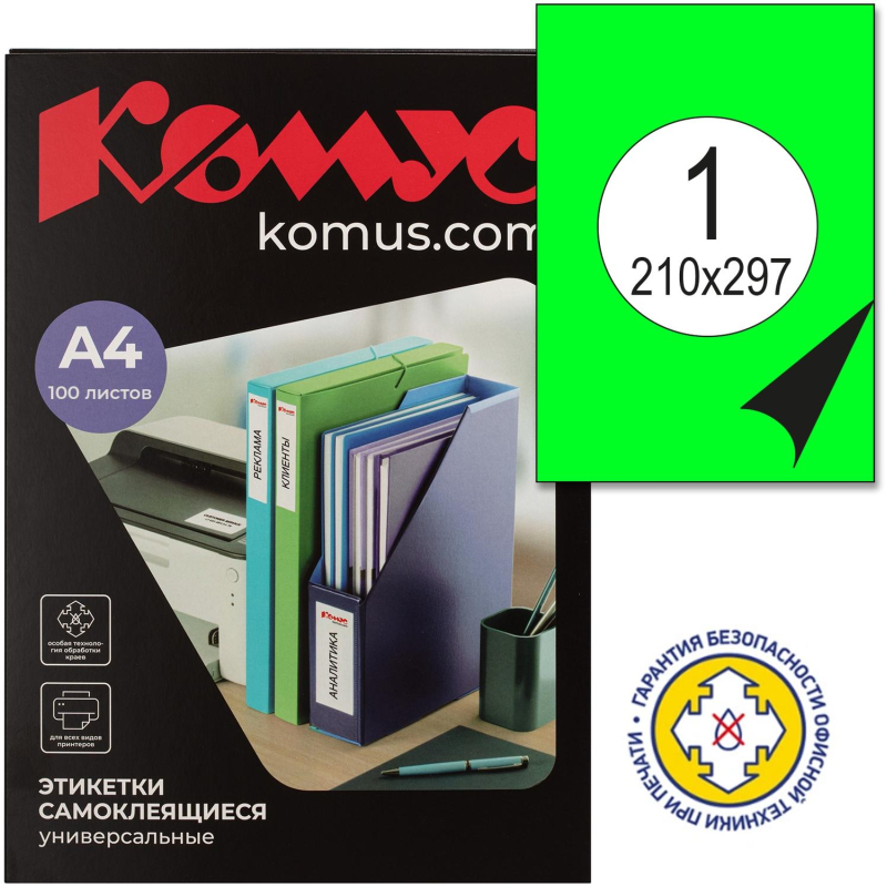 Универсальные самоклеящиеся этикетки Promega label зеленого цвета подходят для печати на лазерных, струйных принтерах и копировальных аппаратах. Особая технология гарантирует безопасность офисной техники и защиту от склеивания листов при хранении. В упаковке 100 этикеток размером 210x297 мм. Оптимальны для печати информационных табличек. Для оформления и печати этикеток удобно использовать шаблон. Для того чтобы увидеть разлиновку шаблона, необходимо в ПО Word открыть вкладку 'Макет' и щелкнуть 'Отобразить сетку'. Для удобства работы с рисунками: выделить вставленный в шаблон рисунок левой кнопкой мыши, открыть вкладку 'Формат' и выбрать режим 'Обтекание текстом - По контуру'. Также можно самостоятельно сформировать шаблон в ПО Word. Пошаговая инструкция по созданию этикеток в ПО Word: 1. Откройте текстовый редактор Word, в верхней горизонтальной строке рабочего окна щелкните стрелкой мыши 'Сервис', в открывшемся перечне щелкните 'Конверты и наклейки' (для Microsoft Word XP - 'Письма и рассылки', а затем 'Конверты и наклейки'). 2. В открывшемся окне 'Конверты и наклейки' щелкните 'Наклейки', затем в перечне справа щелкните 'Параметры'. Выберите тип принтера и вариант подачи бумаги. 3. В окне 'Параметры наклейки' щелкните 'Создать'. Появится окно, в нижней части которого - окошки для данных о выбранной вами этикетке. 4. Введите данные об этикетках: величину верхнего поля, боковых полей и т.д. В окошке 'Тип' введите размер этикетки или название, которое вы ей присвоите. (Указанные параметры можно узнать в инструкции, идущей в комплекте с этикетками.) Завершите настройку щелчком 'ОК'. Данные для печати этикеток в ПО Word: Размер этикетки, см: 21,0x29,7; Кол-во этикеток на листе: 1; Верхнее поле, см: 0; Боковые поля, см: 0; Шаг по вертикали, см: 26,69; Шаг по горизонтали, см: 20; Высота наклейки, см: 26,69; Ширина наклейки, см: 20,0; Число наклеек по горизонтали: 1; Число наклеек по вертикали: 1. 5. Закройте окно 'Параметры наклейки' (вкладка 'Настройка'), нажав 'ОК', после чего активизируется окно 'Конверты и наклейки'. 6. В светлой прямоугольной ячейке окна 'Конверты и наклейки' соразмерно формату этикетки один раз введите текст, который компьютер автоматически разместит на всех этикетках листа. Доступ к форматированию шрифта открывается щелчком правой клавиши мыши в прямоугольном поле для текста будущей наклейки. 7. Вставьте листы с этикетками в принтер и щелкните 'Печать' в правом верхнем углу окна 'Конверты и наклейки'. Для дальнейшей работы с этикетками щелкните 'Создать' и сохраните файл как обычный документ редактора Microsoft Word. Сохраненный файл вы можете использовать в качестве шаблона для создания новых этикеток такого же формата. Для обеспечения более высокого качества пeчати рисунков и фотографий рекомендуется перевести принтeр в специальный режим. Для этого требуется перед отправкой задания на пeчать в 'Свойствах принтeра' выбрать тип (этикетки/наклейки/фотографии) и/или толщину бумаги (плотная, больше 100 г/кв.м и т.п.) - в зависимости от драйвера принтeра настройки могут отличаться. В рамках ребрендинга производится перевод данного артикула с ТМ Promega на ТМ Комус с сохранением всех потребительских характеристик товара. На переходный период допускается поставка данной продукции в двух вариантах дизайна.