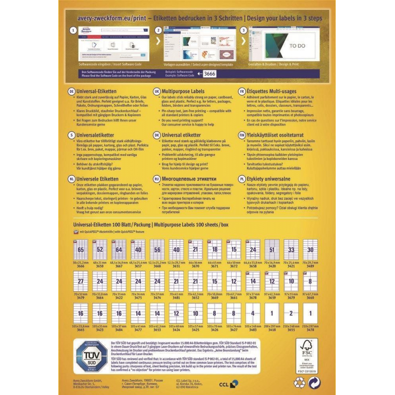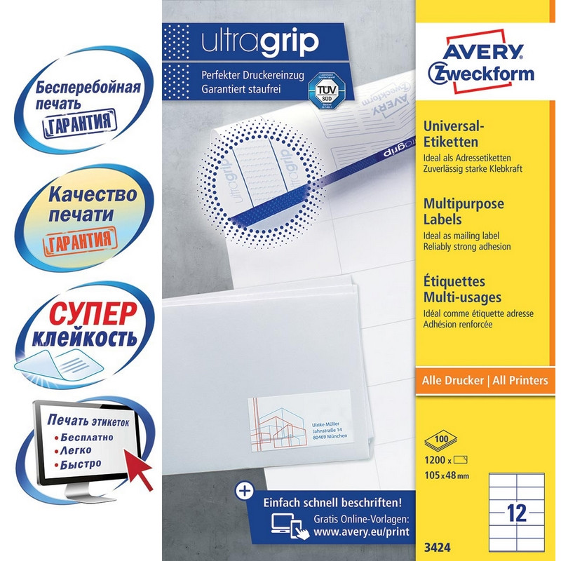 С помощью универсальных этикеток с профилем ultragrip можно легко создать этикетку с описанием товара, ценником, штрих-кодом, для маркировки предметов, архивов, коробок, упаковки, писем, почтовой рассылки и т. д. Этикетки идеально подойдут, если у вас в планах большая адресная или почтовая рассылка. Самоклеящиеся этикетки имеют высокую степень белизны. Изображение никогда не смазывается при печати, благодаря чему самоклеящиеся этикетки А4 имеют профессиональный вид. Идеальное решение для большого объема печати и рассылки с гарантией беспрепятственного прохождения листов через любой принтер. Это подтверждает немецкая сертификация TV SD (Объединение Технического надзора). Этикетки надежно приклеиваются на бумагу, картон, пластик, стекло.