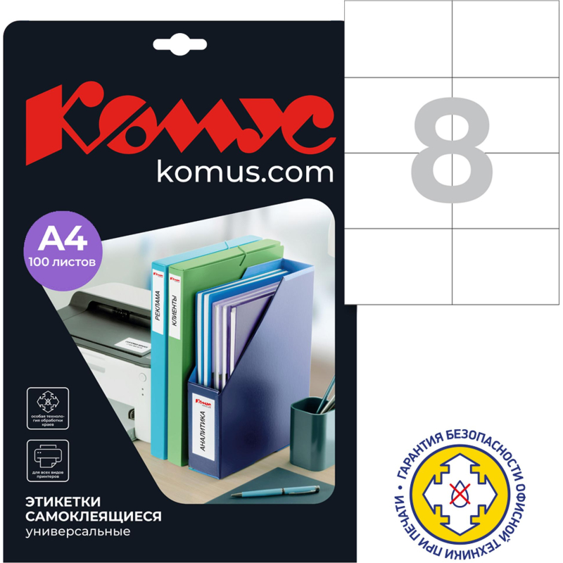 Самоклеящиеся этикетки Promega label подходят для печати на лазерных принтерах и копировальных аппаратах. При печати на этикетках использовать настройки принтера 'Печать этикеток'. Особая технология гарантирует безопасность офисной техники при печати и защиту от склеивания листов при хранении. Сферы применения - адресные наклейки на конверты, наклейки на товары, штрихкоды, ценники, предупреждения. Для оформления и печати этикеток удобно использовать шаблон. Для того чтобы увидеть разлиновку шаблона, необходимо в ПО Word открыть вкладку 'Макет' и щелкнуть 'Отобразить сетку'. Для удобства работы с рисунками: выделить вставленный в шаблон рисунок левой кнопкой мыши, открыть вкладку 'Формат' и выбрать режим 'Обтекание текстом - По контуру'. Также можно самостоятельно сформировать шаблон в ПО Word. Пошаговая инструкция по созданию этикеток в ПО Word: 1. Откройте текстовый редактор Word, в верхней горизонтальной строке рабочего окна щелкните стрелкой мыши 'Сервис', в открывшемся перечне щелкните 'Конверты и наклейки' (для Microsoft Word XP - 'Письма и рассылки', а затем 'Конверты и наклейки'). 2. В открывшемся окне 'Конверты и наклейки' щелкните 'Наклейки', затем в перечне справа щелкните 'Параметры'. Выберите тип принтера и вариант подачи бумаги. 3. В окне 'Параметры наклейки' щелкните 'Создать'. Появится окно, в нижней части которого - окошки для данных о выбранной вами этикетке. 4. Введите данные об этикетках: величину верхнего поля, боковых полей и т.д. В окошке 'Тип' введите размер этикетки или название, которое вы ей присвоите. (Указанные параметры можно узнать в инструкции, идущей в комплекте с этикетками.) Завершите настройку щелчком 'ОК'. Данные для печати этикеток в ПО Word: Размер этикетки, см: 10,5x7,4; Кол-во этикеток на листе: 8; Верхнее поле, см: 0; Боковые поля, см: 0; Шаг по вертикали, см: 7,42; Шаг по горизонтали, см: 10,5; Высота наклейки, см: 7,42; Ширина наклейки, см: 10,5; Число наклеек по горизонтали: 2; Число наклеек по вертикали: 4. 5. Закройте окно 'Параметры наклейки' (вкладка 'Настройка'), нажав 'ОК', после чего активизируется окно 'Конверты и наклейки'. 6. В светлой прямоугольной ячейке окна 'Конверты и наклейки' соразмерно формату этикетки один раз введите текст, который компьютер автоматически разместит на всех этикетках листа. Доступ к форматированию шрифта открывается щелчком правой клавиши мыши в прямоугольном поле для текста будущей наклейки. 7. Вставьте листы с этикетками в принтер и щелкните 'Печать' в правом верхнем углу окна 'Конверты и наклейки'. Для дальнейшей работы с этикетками щелкните 'Создать' и сохраните файл как обычный документ редактора Microsoft Word. Сохраненный файл вы можете использовать в качестве шаблона для создания новых этикеток такого же формата. Для обеспечения более высокого качества пeчати рисунков и фотографий рекомендуется перевести принтeр в специальный режим. Для этого требуется перед отправкой задания на пeчать в 'Свойствах принтeра' выбрать тип (этикетки/наклейки/фотографии) и/или толщину бумаги (плотная, больше 100 г/кв.м и т.п.) - в зависимости от драйвера принтeра настройки могут отличаться. В рамках ребрендинга производится перевод данного артикула с ТМ Promega на ТМ Комус с сохранением всех потребительских характеристик товара. На переходный период допускается поставка данной продукции в двух вариантах дизайна.