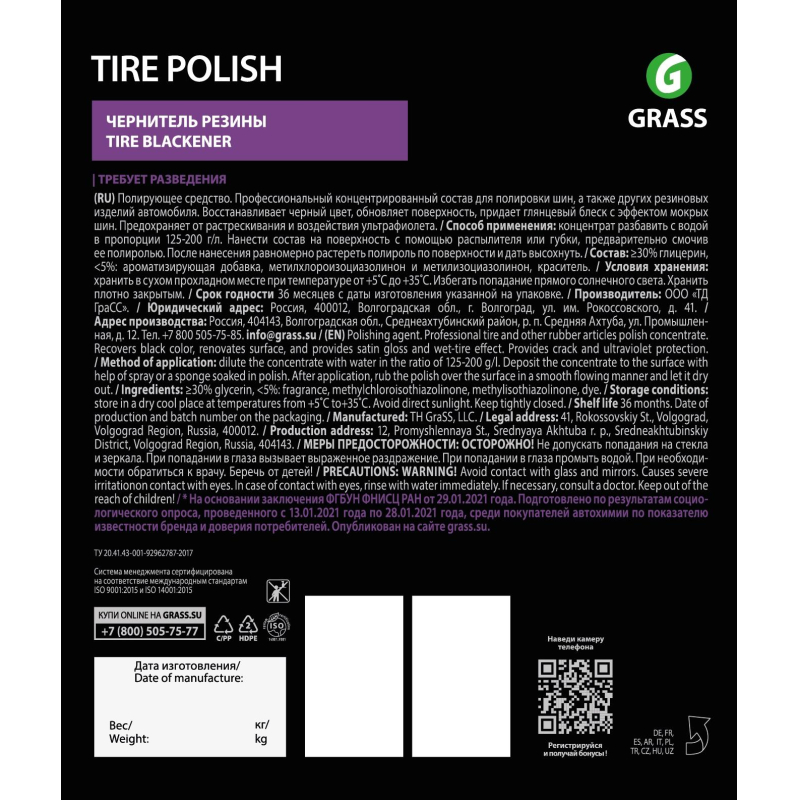 Чернитель резины Grass Tire Polish 5.5 кг (концентрат). Назначение: профессиональный концентрированный состав для полировки шин, а также других резиновых изделий автомобиля. Восстанавливает черный цвет, обновляет поверхность, придает глянцевый блеск с эффектом мокрых шин. Предохраняет от растрескивания и воздействия ультрафиолета. Способ применения: концентрат разбавить с водой в пропорции 150-250 г/л. Нанести состав на поверхность с помощью распылителя или губки, предварительно смочив ее полиролью. После нанесения равномерно растереть полироль по поверхности и дать высохнуть. Состав: 30% глицерин,<5%: ароматизирующий компонент, метилхлороизотиазолинон, метилизотиазолинон, краситель. Срок годности: 36 месяцев с момента производства (при соблюдении условий хранения рекомендованных производителем).