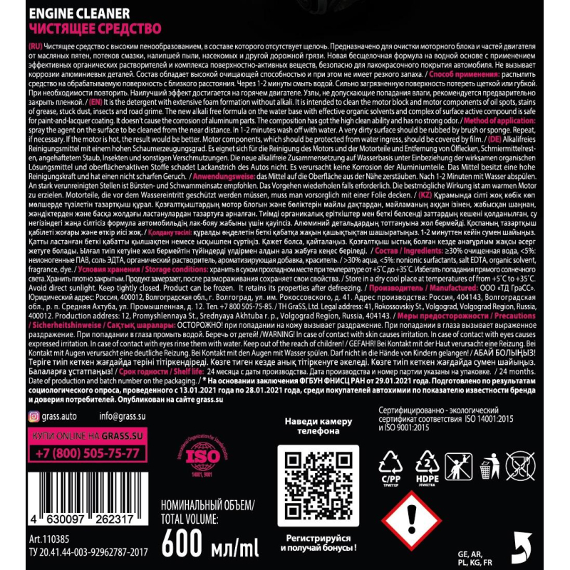 Очиститель двигателя Grass Engine Cleaner 600 мл. Назначение: нейтральное чистящее средство с высоким пенообразованием. Предназначено для очистки моторного блока и частей двигателя от масляных пятен, потеков смазки, налипшей пыли, насекомых и другой дорожной грязи. Новая бесщелочная формула на водной основе с применением эффективных органических растворителей и комплекса поверхностно-активных веществ является абсолютно безопасной для рук и лакокрасочного покрытия автомобиля. Не вызывает коррозии алюминиевых деталей. Состав обладает высокой очищающей способностью и при этом не имеет резкого запаха. Способ применения: распылить средство на обрабатываемую поверхность с близкого расстояния. Через 1-2 минуты смыть водой. Сильно загрязненную поверхность потереть щеткой или губкой. При необходимости повторить. Наилучший эффект достигается на горячем двигателе. Узлы, не допускающие попадания влаги, рекомендуется предварительно закрыть пленкой. Состав: 30% очищенная вода; <5%: органический растворитель, неионогенные ПАВ, соль ЭДТА, ароматизирующая добавка, краситель. Срок годности: 24 месяца с момента производства (при соблюдении условий хранения рекомендованных производителем).
