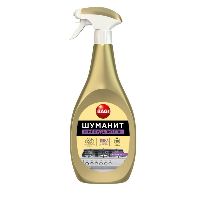 Чистящее средство для кухни Bagi Шуманит пена антижир 400 мл. Назначение. Средство предназначено для очищения от загрязнений: жир застывший пригоревший, маслянистые загрязнения, копоть, нагар, пригоревший сахар. Подходит для поверхностей: плита, вытяжк, кухонный фартук, посуда готовочная, кухонная мойка и др. Способ применения. Распылить препарат по поверхности, подождать несколько секунд, протереть влажной тряпкой и сполоснуть водой. В случае необходимости повторить действие и потереть поверхность. Меры предосторожности. При работе использовать резиновые перчатки. При попадании средства в глаза или на кожу промыть большим количеством воды, при необходимости обратиться к врачу. Хранить в недоступном для детей месте. Состав. Гидроксид натрия >15%, но <20%, комплексообразующий агент >5%, но <15%, ПАВ >5%, но <15%, растворители <5%, компоненты, ароматизатор. Условия хранения Хранить в сухом прохладном месте. Предохранять от попадания прямых солнечных лучей. Срок годности. Указан на упаковке.