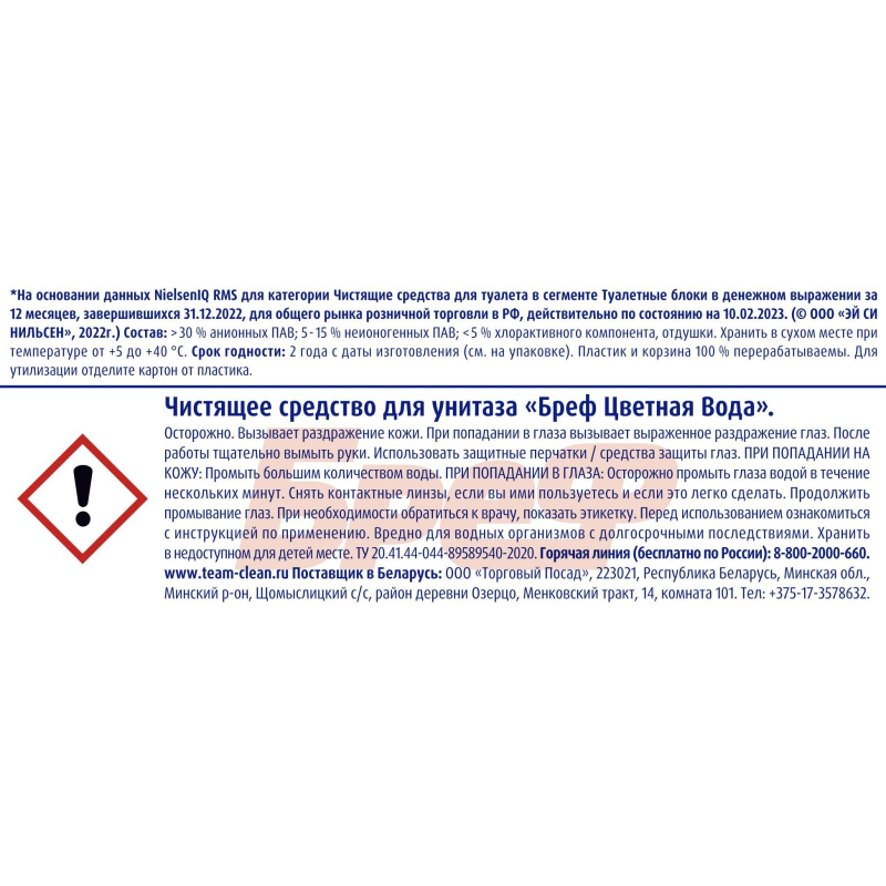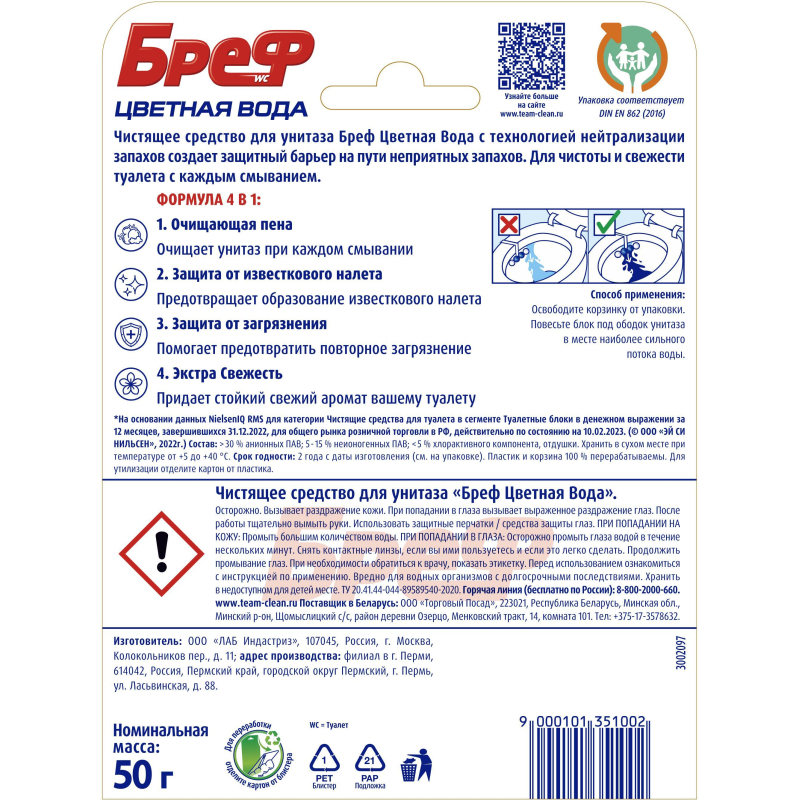 Блок для унитаза гигиенический Бреф Колор-Актив С хлор-компонентом Назначение Чистящее средство для унитаза Bref Color Aktiv. Способ применения Освободите корзинку от упаковки. Повесьте Bref под ободок унитаза. Меры предосторожности Вызывает раздражение кожи. При попадании в глаза вызывает серьезное раздражение глаз. После работы тщательно вымыть руки. Использовать защитные перчатки/средства защиты глаз. При попадании в глаза: Осторожно промыть глаза водой в течение нескольких минут. Снять контактные линзы, если Вы ими пользуетесь и если это легко сделать. Продолжить промывание глаз. При необходимости обратиться к врачу, показать этикетку. При попадании на кожу: промыть большим количеством воды. При попадании цветной воды на сиденье для унитаза или другие поверхности, немедленно смыть водой. Состав >30 % солей неорганических, анионных ПАВ; <5 % красителя, комплексообразователя, хлорактивного компонента растворителя, отдушки (в т. ч. лимонена. бутилфенил метилпропионаля, линалоола). ГОСТ/ТУ Нет. Условия хранения Хранить в сухом месте от 5 °С до 40 °С. Хранить в недоступном для детей месте. Перед использованием ознакомиться с информацией по применению. Вредно для водных организмов с долгосрочными последствиями. Срок годности 2 года.