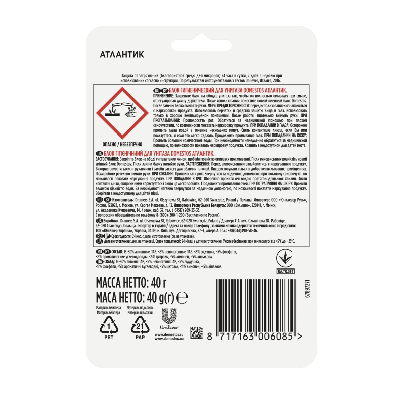 Блок гигиенический для унитаза Domestos Сила 3 в 1 - три действия в одном эффективном средстве. Благодаря формуле с микрочастицами оно содержит целых три преимущества, обеспечивающих защиту от загрязнений, а значит и от микробов: борется с налетом, поддерживает чистоту, добавляет блеск, оставляя свежесть надолго. Можно выбрать блок с хвойным, морским или лимонным ароматом. Используйте сменные блоки для экономии денег и для сокращения потребления пластика! Регулируемое крепление позволяет разместить блок на ободке любой ширины. Легко заменяется сменным блоком, позволяя экономить деньги. Domestos Сила 3 в 1 - на защите чистоты, гигиены, а значит и здоровья вашей семьи. Для достижения максимального эффекта закрепите блок на ободке унитаза так, чтобы он полностью омывался при смыве. Перед применением ознакомьтесь с инструкцией на упаковке. xпо результатам тестов Unilever по сравнению со стикером для очищения унитаза Domestos. Блок гигиенический для унитаза Domestos - три действия, которые объединились в одном эффективном средстве для поддержания чистоты, блеска и приятного аромата в вашем туалете. Domestos блок Сила 3 в 1- это эффективное средство, которое содержит в себе не один, а целых три преимущества, обеспечивающих защиту от загрязнений, а значит и микробов. При использовании блоков Domestos Сила 3 в 1 каждое смывание - заряд свежего аромата, который остается в течение длительного времени. Ключевые достоинства: До 300 смываний - лимонная/хвойная/морская свежесть при каждом смыве воды; - обладает микрочастицам; - заряд свежего аромата; - защита от загрязнений и микробов; - экономный за счет возможности смены блока; - крепление регулируется, что позволяет разместить блок на любом ободке; - антиналет; - гигиеническая чистота. Состав: >30% Анионные ПАВ, 5-15% отдушка, <5%: фосфаты, бутилфенилметилпропиональ, фосфонаты, альфаизометилионон, лимонен, бензиловый спирт, линалоол, цитронеллол, гексилциннамал. Способ применения: Закрепите блок на ободке унитаза так, чтобы он полностью омывался при смыве, отрегулировав длину держателя. В процессе использования гелевая полоса не растворяется до конца. После использования удалите нерастворившиеся остатки гелевой полосы и поместите новый сменный блок Domestos. После замены блока вымойте руки.