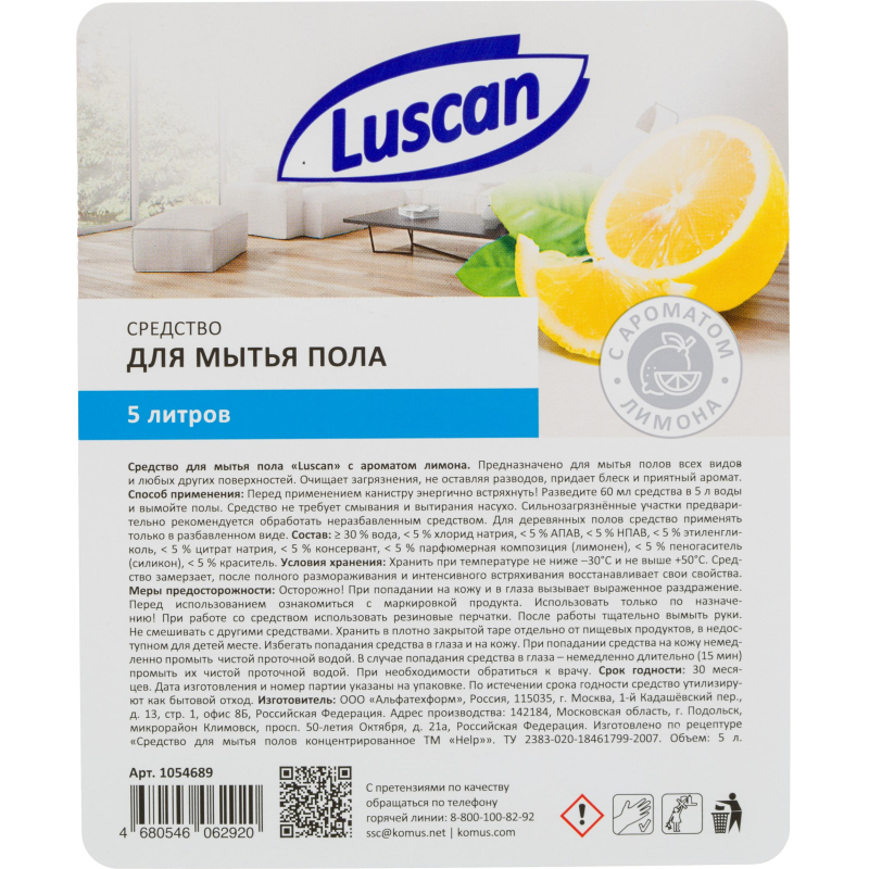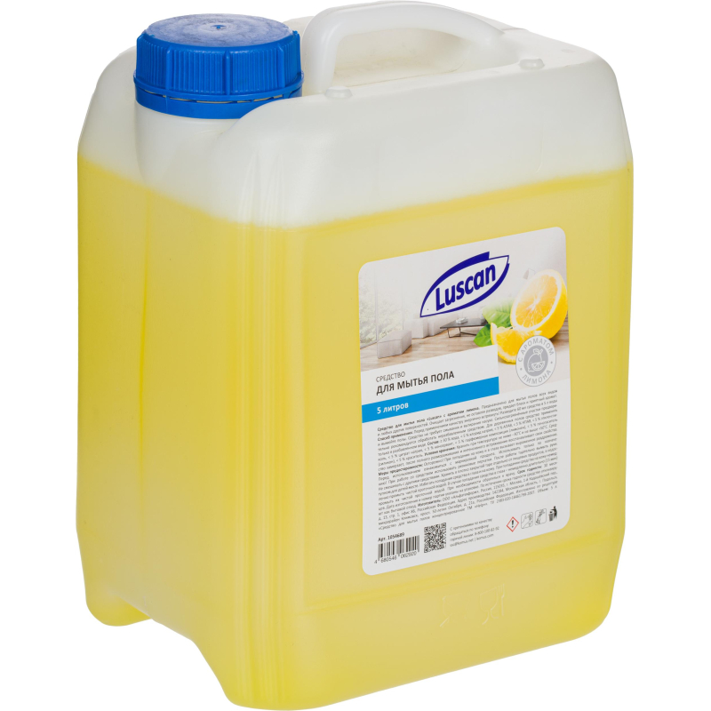 Средство для мытья пола Luscan всех типов 5 л Назначение Моет легко и быстро ламинат, кафель, линолеум, дерево. Перед применением флакон встряхнуть! Способ применения Разведите 60 мл (2 колпачка) средства в 5 л воды и вымойте полы. Средство не требует смывания и вытирания насухо. Сильнозагрязнённые участки предварительно рекомендуется обработать неразбавленным средством. Для деревянных полов средство применять только в разбавленном виде. Меры предосторожности Осторожно! При попадании средства в глаза вызывает выраженное раздражение! При попадании средства на кожу вызывает слабое раздражение! Использовать только по назначению! Хранить в плотно закрытой таре, отдельно от пищевых продуктов, в недоступном для детей месте. Рекомендуем использовать резиновые перчатки. После работы тщательно вымыть руки. Избегать попадания средства в глаза. При попадании средства в глаза немедленно промыть их большим количеством чистой воды. При необходимости обратиться к врачу. Состав > 30 % вода, > 5 %, но < 15 % АПАВ, < 5 % хлорид натрия, < 5 % НПАВ, < 5 % этиленгликоль, < 5 % цитрат натрия, < 5 % консервант, < 5 % парфюмерная композиция (лимонен), < 5 % пеногаситель (силикон), < 5 % краситель. Условия хранения Хранить при температуре не ниже -30 и не выше 50 °С. Средство замерзает, после полного размораживания и интенсивного встряхивания восстанавливает свои свойства. Срок годности 30 месяцев. Дата изготовления и номер партии указаны на флаконе. По истечении срока годности средство утилизируют как бытовой отход.
