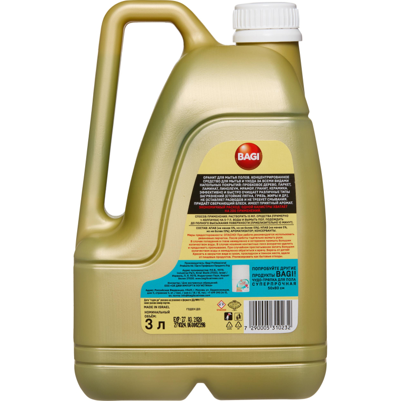 Средство для мытья пола Оранит Bagi концентрированное, 3 л Назначение: Средство является универсальным и подходит для мытья полов из разных материалов. С его помощью можно удалить различные виды загрязнений с паркета, ламината, линолеума, мрамора, гранита, плитки и других твердых поверхностей. Использование состава возобновляет блеск поверхностей и обеспечивает в помещении приятный аромат. Не требует смывания, не оставляет разводов или подтеков. Нейтральный рН и наличие защитных компонентов обеспечивают безопасность для рук. Способ применения: 60 мл средства растворить в 6-10 литрах воды. При сильных загрязнениях повторить мытье или увеличить концентрацию состава до 100 мл. Меры предосторожности: При попадании в глаза промыть водой. При необходимости обратиться за помощью к врачу. Состав: Анионные поверхностно-активные вещества >5%, но <15%, неионогенные поверхностно-активные вещества >5%, но <15%, ароматизатор, консерванты. Условия хранения: Хранить в темном месте при температуре не больше 40 °С. Беречь от детей. Срок годности: 36 месяцев.