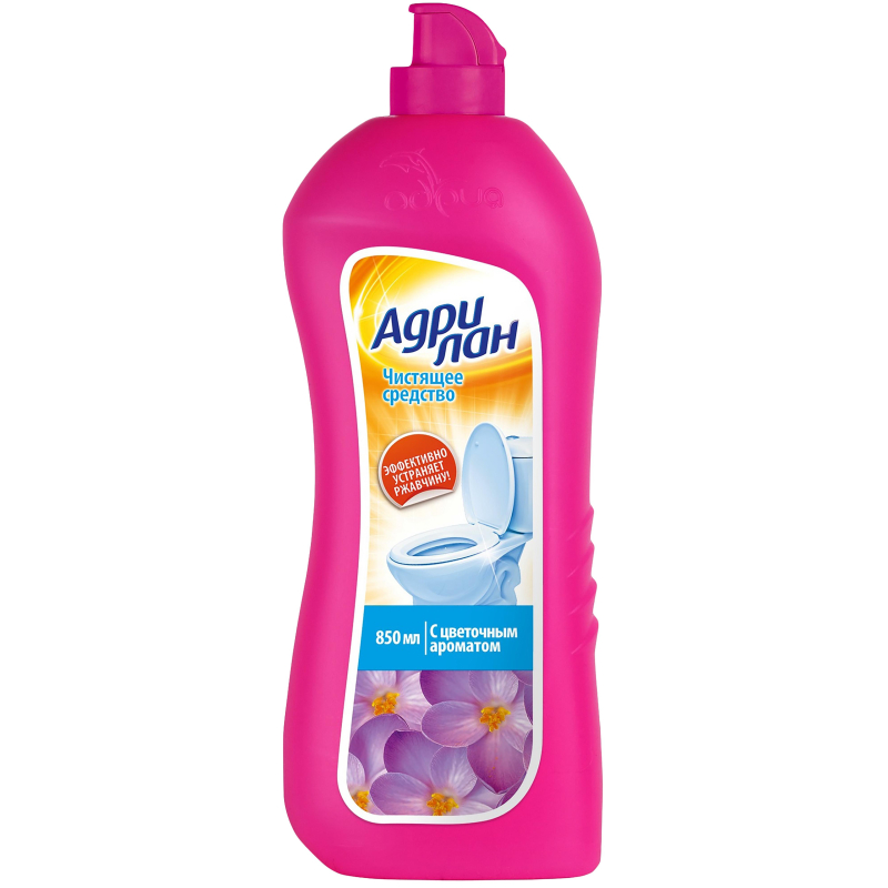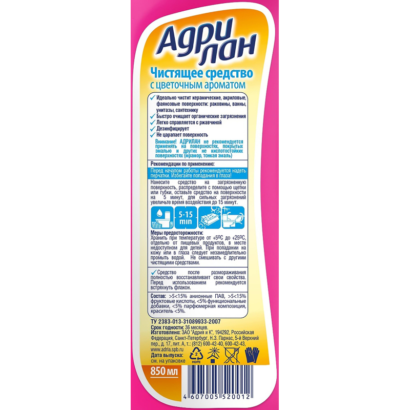 Средство для сантехники Адриа Адрилан 850 мл. Назначение Средство для быстрого и эффективного очищения от загрязнений и ржавчины. Дезинфицирует. Подходит для: любой сантехники из фаянса, ванн покрытых кислостойкой эмалью, и пр. хромированных, медных, латунных и нержавеющих покрытий. Способ применения Перед использованием рекомендуется встряхнуть флакон. Равномерно нанесите средство на очищаемую поверхность с помощью влажной губки или щетки с коротким ворсом, оставьте на 5 минут (для сильных загрязнений увеличьте время воздействия до 15 минут), потом тщательно удалите загрязнения и смойте водой. Не рекомендуется применять на не кислотостойких поверхностях (эмаль, мрамор, глазурь и т.д.)! Меры предосторожности При работе со средством обязательно использование перчаток! Избегать попадания на кожу и в глаза! Состав: 5-15% анионные ПАВ, 5-15% фруктовые кислоты, <5% функц. компоненты, <5% краситель, <5% парфюмерная композиция, вода. Условия хранения Хранить отдельно от пищевых продуктов, в недоступном для детей месте, при температуре от 5 °С до 25 °С. При размораживании полностью восстанавливает свои свойства. Срок годности: 24 месяца. ГОСТ/ТУ2383-013-31089933-2007