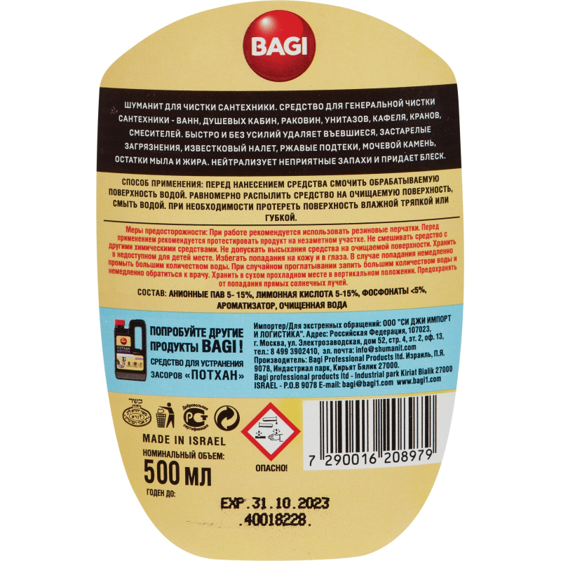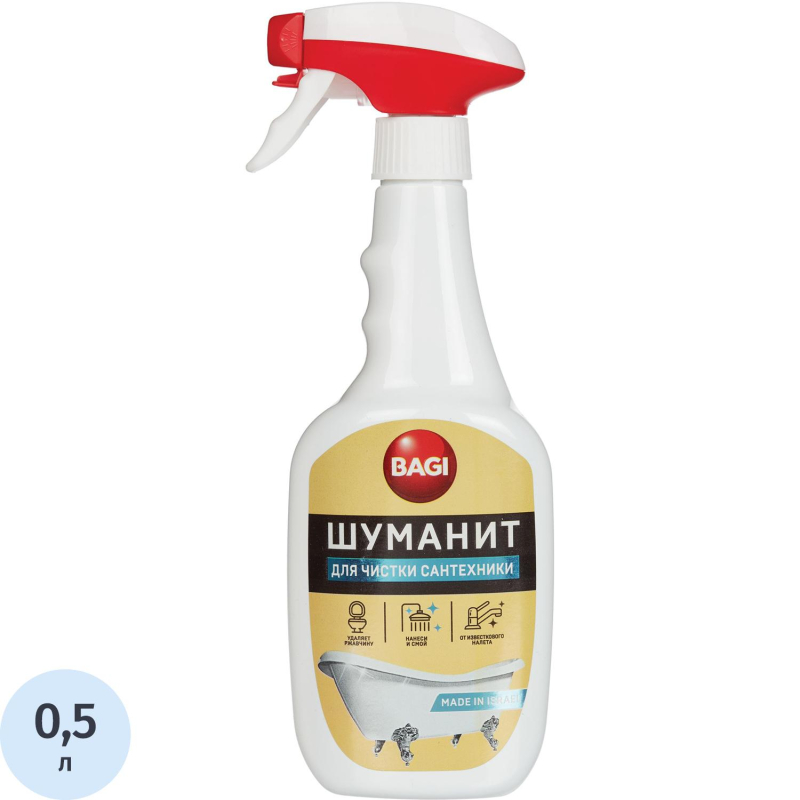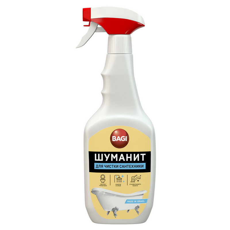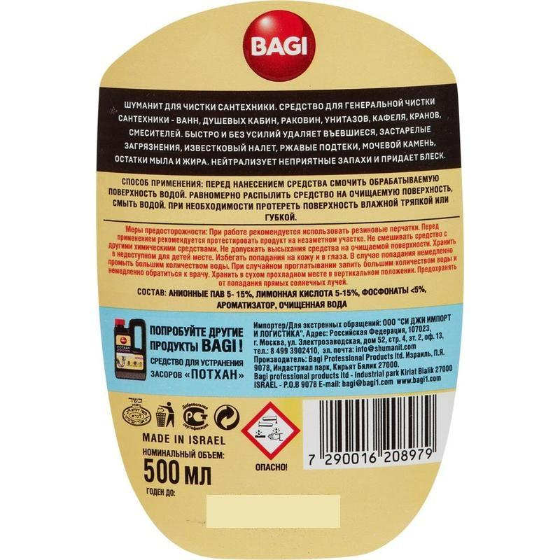 Средство для сантехники Bagi Шуманит 500 мл. НазначениеСредство предназначено для чистки загрязнений: мочевых камней, стойких налетов, водных камней, ржавчины, застарелой грязи и известкового отложения. Способ примененияРаспределить препарат губкой или влажной тряпкой по поверхности, протереть и смыть водой. В случае необходимости повторить действие. Вытереть поверхность сухой тряпкой. Меры предосторожностиНе допускайте высыхания средства на поверхности до окончания чистки. Состав: неорганическая кислота, активизированные вещества, ароматизатор. Условия храненияТемпература хранения от 5 °C до 30 °C. Температура при перевозке и при непродолжительном хранении от -30 °C до 45 °C. Повторно не замораживать! Срок годности: 5 лет.