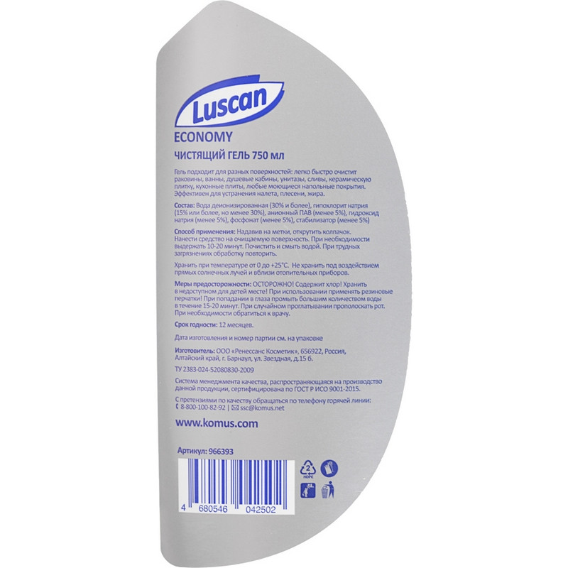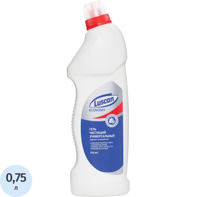 Средство для сантехники Luscan Economy с хлором 750 мл. Назначение Гель подходит для разных поверхностей: легко быстро очистит раковины, ванны, душевые кабины, унитазы, сливы, керамическую плитку, кухонные плиты, любые моющиеся напольные покрытия. Эффективен для устранения налета, плесени, жира и т.п. Также предназначен для удаления различных загрязнений, в т.ч. известкового налета и ржавчины. Экономичен в расходе. Способ применения Надавив на метки, открутить колпачок. Нанести средство на очищаемую поверхность. При необходимости выдержать 10-20 минут. Почистить и смыть водой. При трудных загрязнениях обработку повторить. Меры предосторожности Осторожно! Содержит хлор! Хранить в недоступном для детей месте! При использовании применять резиновые перчатки! При попадании в глаза промыть большим количеством воды в течение 15-20 минут. При случайном проглатывании - прополоскать рот. При необходимости обратиться к врачу. Состав: вода деионизированная (30% и более), гипохлорит натрия (15% или более, но менее 30%), анионный ПАВ (менее 5%), гидроксид натрия (менее 5%), фосфонат (менее 5%), стабилизатор (менее 5%). Условия хранения Хранить при температуре от 0 °С до +25 °С. Не хранить под воздействием прямых солнечных лучей и вблизи отопительных приборов. Срок годности: 12 месяцев. ГОСТ/ТУТУ 2383-024-52080830-2009 Относится к сегменту 'суперэконом' - товар с минимальными требованиями к качеству для тех, кто хочет сэкономить. Товар отвечает основным потребительским характеристикам.