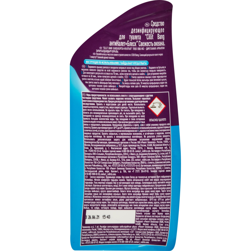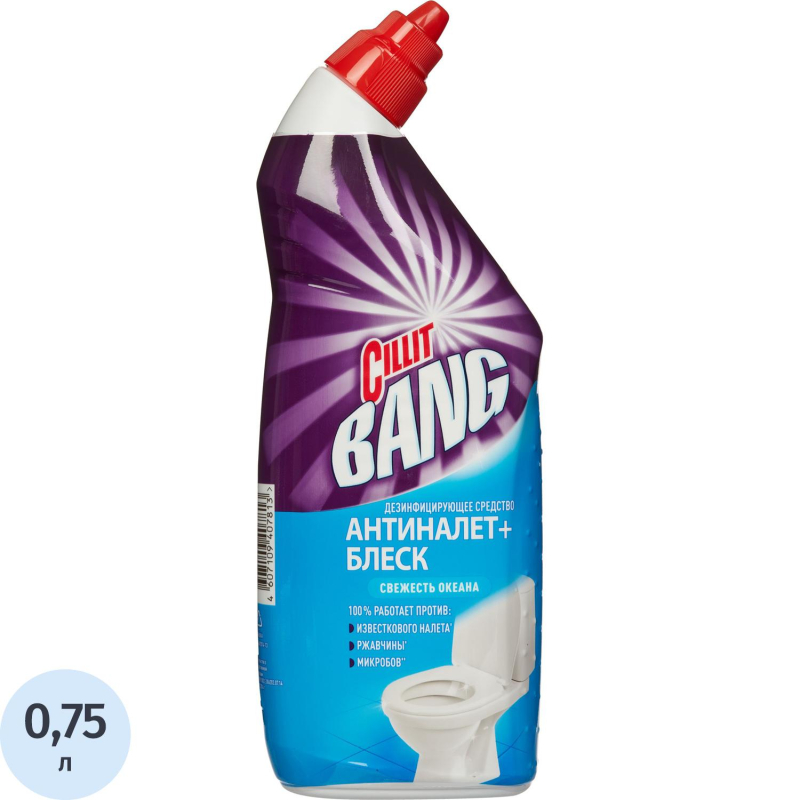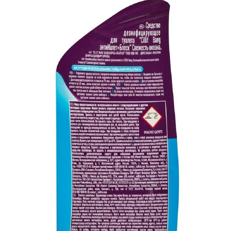 Средство для сантехники Cillit Bang Антиналет + Блеск концентрат 750 мл. НазначениеСредство предназначено для чистки унитаза. Удаляет известковый налет, мочевой камень, ржавчину, загрязнения. Чистит и дезинфицирует под ободком унитаза, убивая 99,9% микробов, ароматизирует туалет. Действует над и под водой. Способ примененияПоднять крышку унитаза и аккуратно направить носик под ободок унитаза. Надавить и нанести медленно по всей окружности так, чтобы гель полностью покрыл поверхность. Для наилучшего результата оставит на 10 минут, затем почистить щеткой и смыть.Подходит для любых унитазов, за исключением унитазов из нержавеющей стали, мраморных или эмалированных поверхностей. Не допускать попадания на другие поверхности, кроме унитаза. Меры предосторожностиПри работе использовать резиновые перчатки. При попадании средства в глаза или на кожу немедленно промыть большим количеством воды, при необходимости обратиться к врачу. Хранить в недоступном для детей месте. Состав: соляная кислота >5%, но <15%, неионогенные и катионные ПАВ <5%, парфюмерная отдушка. Условия храненияХранить в сухом прохладном месте в вертикальном положении. Предохранять от попадания прямых солнечных лучей. Срок годности: 2 года с даты изготовления.