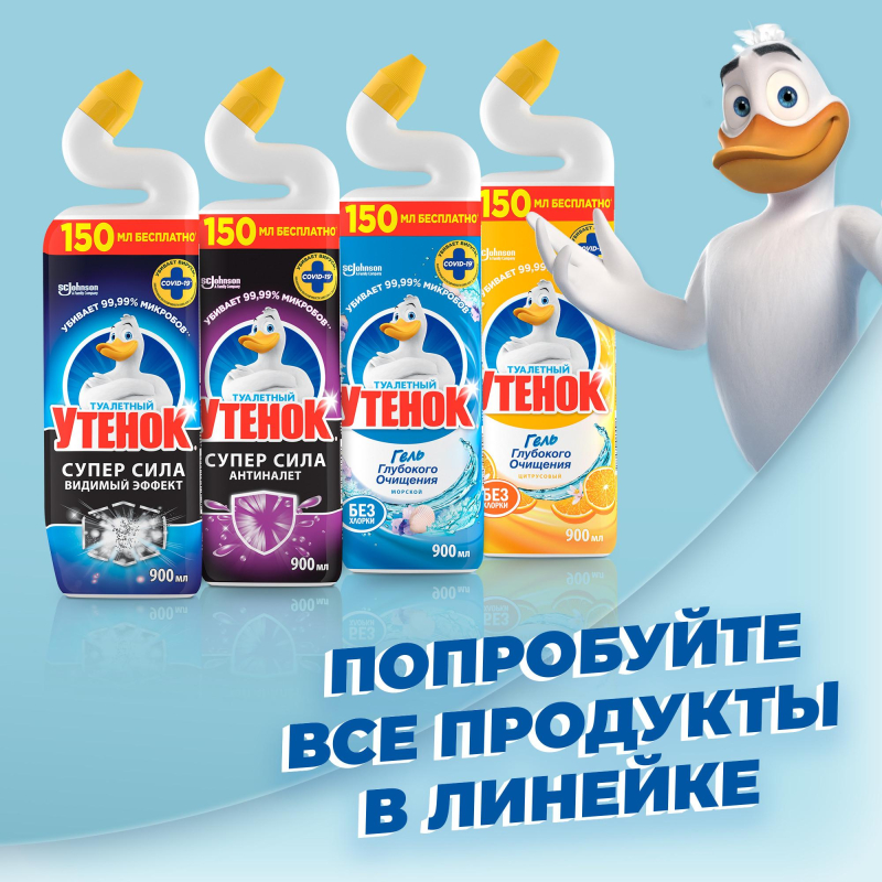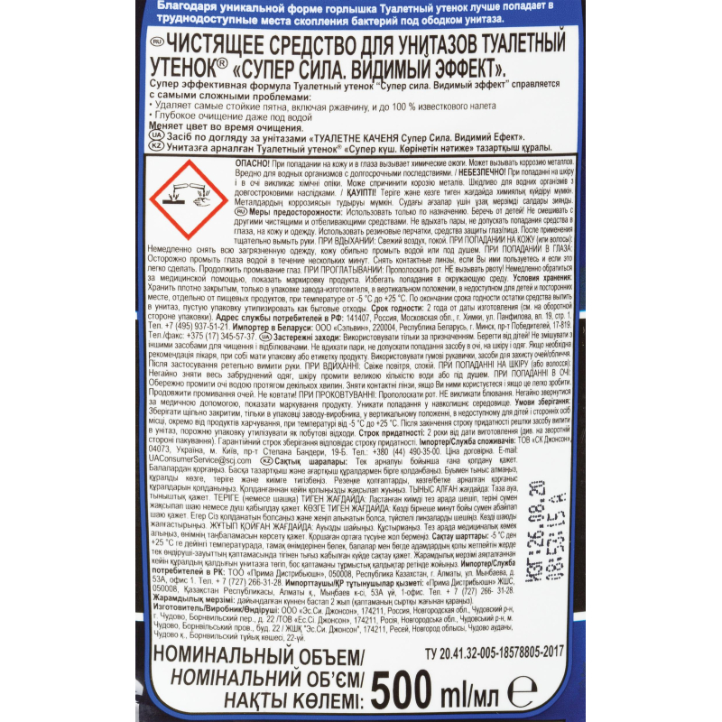 Средство для сантехники Утенок Супер Сила Видимый Эффект 500 мл. Назначение. Супер эффективная формула чистящего средства для унитаза Туалетный Утенок "Видимый Эффект" справляется с самыми сложными проблемами: Удаляет стойкие пятна, включая ржавчину и до 100% изветкового налета, эффективна даже под водой. Убивает 99,99% микробов, включая вирусы, аналогичные по устойчивости SARS-COV-2, вызывающему COVID-19x. Благодаря уникальной форме горлышка бутылки лучше попадает в труднодоступные места скопления бактерий под ободком унитаза. Гель меняет цвет во время очищения, а значит вы можете видеть, как он работает! Дезинфицирующий эффект в отношении исследованных вирусов (Poliovirus, Adenovirus) достигается при экспозиции 15 минут. Суперэффективная формула Туалетный Утенок Суперсила Видимый эффект справляется с самыми сложными проблемами: удаляет самые стойкие пятна, включая ржавчину и известковый налет; глубокое очищение даже под водой. Меняет цвет во время очищения. Способ применения. Надавив на метки, открутите колпачок. Поднимите сидение унитаза. Нанесите средство под ободок унитаза по окружности. Для максимального результата: после нанесения средства используйте ершик для очистки поверхностей над и под водой. Для удаления загрязнений в нижней части унитаза налейте средство в воду и оставьте на 60 минут, смойте. Плотно закрутите колпачок. Используйте регулярно для поддержания чистоты и свежести в туалете. Меры предосторожности. Использовать только по назначению. Беречь от детей! Не смешивать с другими чистящими и отбеливающими средствами. Не вдыхать пары, не допускать попадания средства в глаза, на кожу и одежду. Использовать резиновые перчатки, средства защиты глаз/лица. После применения тщательно вымыть руки. Состав. вода, кислота соляная > 5%, но < 15%, н-ПАВ < 5%, отдушка, амфотерные ПАВ < 5%, краситель. Условия хранения. Хранить плотно закрытым, только в упаковке завода-изготовителя, в вертикальном положении, в недоступном для детей и посторонних месте, отдельно от пищевых продуктов, при температуре от -5 °C до 25 °C. Срок годности. 24 месяца