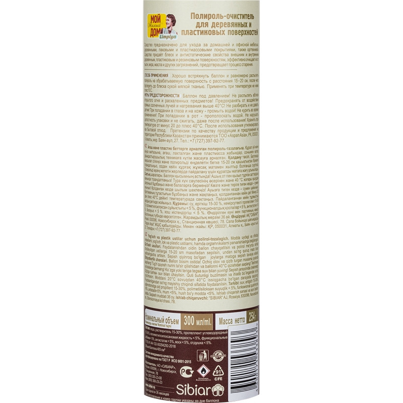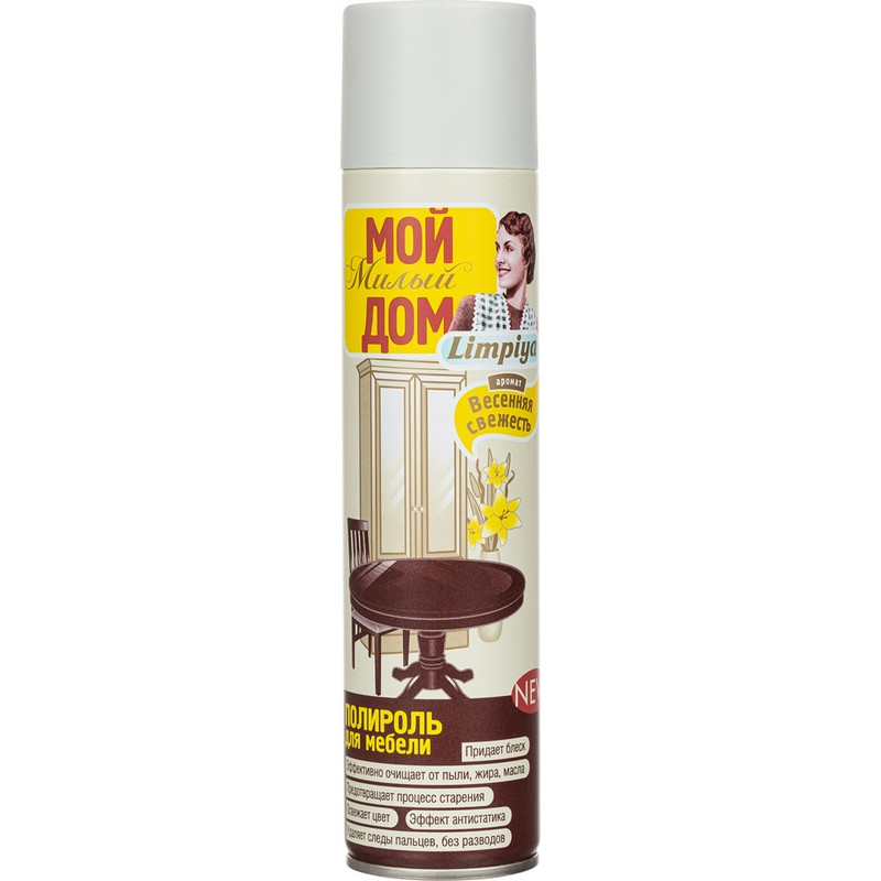 Полироль для мебели Limpia Весенняя свежесть 300 мл. Назначение. Средство предназначено для ухода за домашней и офисной мебелью, деревянными, лаковыми и пластмассовыми покрытиями, а также оргтехникой. Средство придает блеск и антистатические свойства внешним и внутренним деревянным, пластиковым и резиновым поверхностям, эффективно очищает их от пыли, жира, масла и других загрязнений, предотвращает процесс старения. Способ применения. Хорошо встряхнуть баллон и равномерно распылить полироль на обрабатываемую поверхность с расстояния 15-20 см, после чего протереть до блеска сухой мягкой тканью. Применять при температуре не ниже + 10°С. Меры предосторожности. Баллон под давлением! Не распылять вблизи открытого огня и раскаленных предметов! Предохранять от воздействия прямых солнечных лучей и нагревания выше 40°С! Не разбирать и не давать детям! При попадании в глаза и на кожу - промыть водой! Не курить во время применения! При попадании в рот - прополоскать водой. Не нарушать целостность упаковки и не сжигать, даже после использования! Состав. Вода, растворитель 15-30%, пропеллент углеводородный 15-30%, полиметилсилоксановая жидкость < 5%, функциональные добавки < 5%, антистатик <5%, воск < 5%, отдушка < 5%. Условия хранения. Хранить при температуре от - 20 до + 40°С. После использования утилизировать как бытовой отход. Срок годности: 36 месяцев. Относится к сегменту 'суперэконом' - товар с минимальными требованиями к качеству для тех, кто хочет сэкономить. Товар отвечает основным потребительским характеристикам.