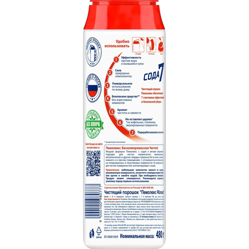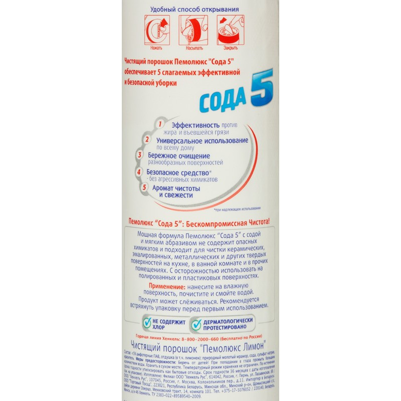 Универсальное чистящее средство Пемолюкс Сода 5 Яблоко порошок 480 г Назначение. Чистящий порошок Пемолюкс Сода 5 Яблоко эффективен против жира и въевшейся грязи. Применяется для универсальной уборки дома. Не содержит хлор. Способ применения. Нанесите на влажную поверхность, почистите и смойте водой. Продукт может слеживаться. Рекомендуется встряхнуть упаковку перед первым использованием. Меры предосторожности. При попадании в глаза промыть большим количеством воды. Состав. <5% амфотерные ПАВ, отдушка (в т.ч. лимонен); природный молотый мрамор, сода, сульфат натрия, краситель. Условия хранения. Хранить в сухом месте. Температурный режим хранения не ограничен. Срок годности. 36 месяцев.