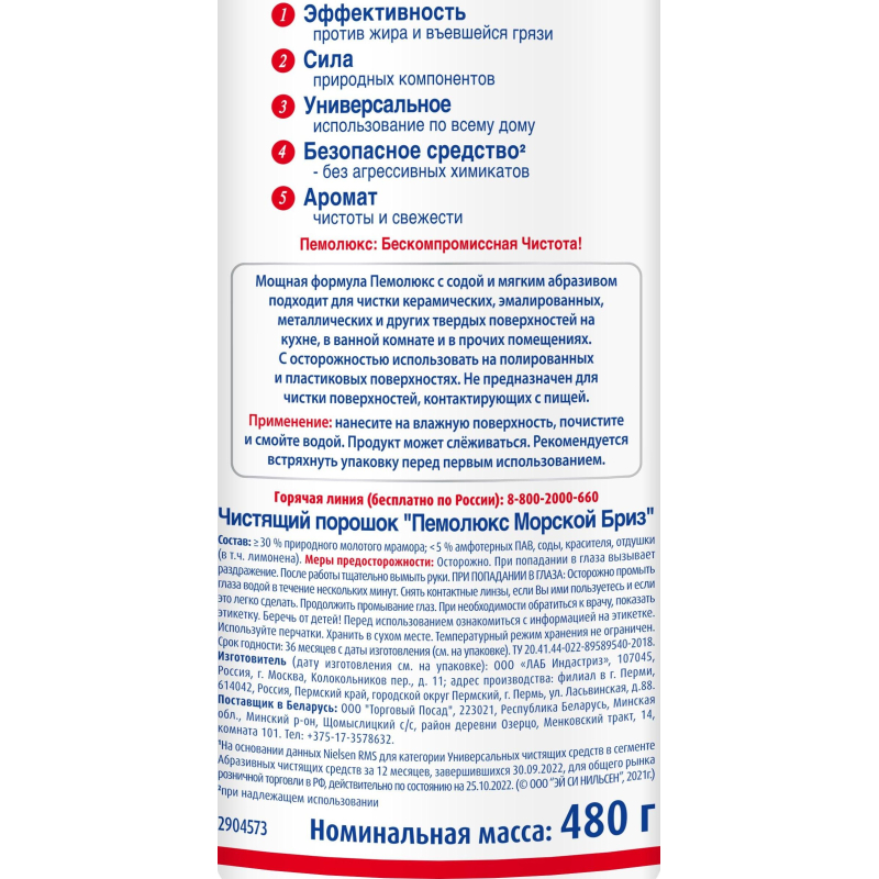 Универсальное чистящее средство Пемолюкс Сода 5 Морской бриз порошок 480 г. Назначение Чистящий порошок Пемолюкс "Сода 5" Морской бриз эффективен против жира и въевшейся грязи. Применяется для универсальной уборки дома. Не содержит хлор. Способ применения Нанесите на влажную поверхность, почистите и смойте водой. Продукт может слеживаться. Рекомендуется встряхнуть упаковку перед первым использованием. Меры предосторожности При попадании в глаза промыть большим количеством воды. Состав: <5% амфотерные ПАВ, отдушка (в т. ч. лимонен); природный молотый мрамор, сода, сульфат натрия, краситель. Условия хранения Хранить в сухом месте. Температурный режим хранения не ограничен. Срок годности: 36 месяцев.
