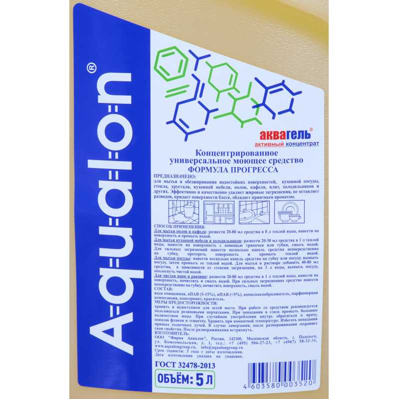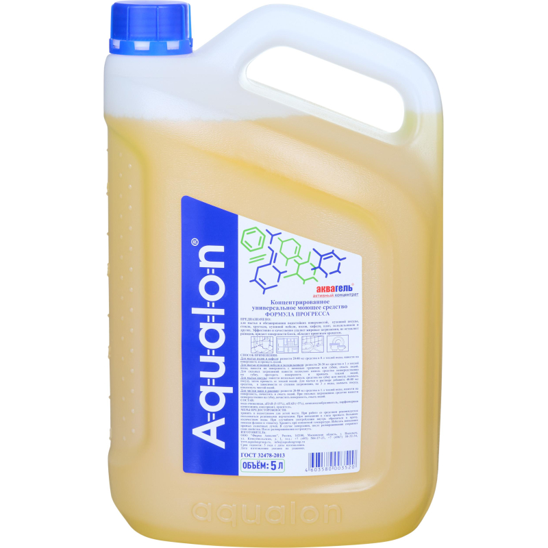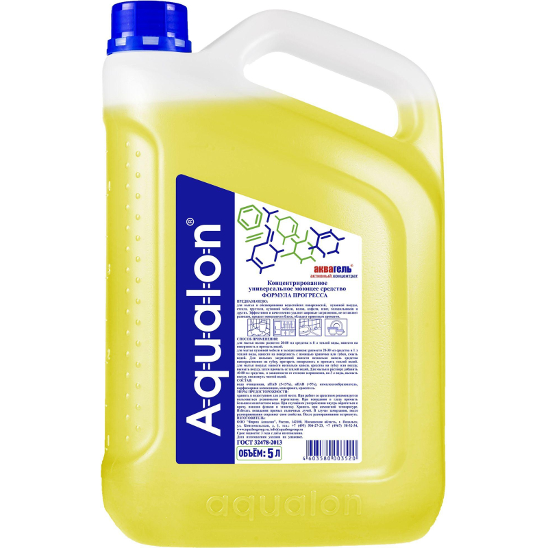 Универсальное чистящее средство Формула Прогресса жидкость 5 л. Назначение: Высокоэффективное средство для мытья и обезжиривания кафеля и полов, водостойких поверхностей, кухонной мебели, плит, холодильников, кухонной посуды, стекла и хрусталя. Эффективно удаляет пыль, грязь, жировые загрязнения. Универсальное средство повышенной концентрации. Не оставляет разводов, придает поверхности блеск, ароматизирует помещение. Способ применения: Для мытья полов и кафеля: развести 20-80 мл средства в 8 л теплой воды, нанести на поверхность и промыть водой. Для мытья кухонной мебели и холодильников: развести 20-30 мл средства в 1 л воды, нанести на поверхность и протереть влажной тряпкой. Для чистки ванн и раковин: развести 20-80 мл средства в 1 л теплой воды, нанести на поверхность и смыть водой. Для сильных загрязнений нанести на губку несколько капель средства, протереть поверхность и промыть теплой водой. Для мытья посуды: нанести несколько капель средства на губку или посуду, вымыть посуду и промыть теплой водой. Для мытья в растворе добавить 40-80 мл средства, в зависимости от степени загрязнения, на 3 л воды, вымыть посуду, ополоснуть чистой водой. Меры предосторожности: Беречь от детей! Избегать попадания средства на слизистые оболочки. При попадании в глаза промыть большим количеством воды и обратиться к врачу. При проглатывании немедленно обратиться к врачу, показав упаковку и этикетку. Состав: Вода очищенная, АПАВ (5-15%), НПАВ (<5%), комплексообразователь (<5%), парфюмерная композиция, консервант, краситель. Условия хранения: Хранить при комнатной температуре. Избегать попадания прямых солнечных лучей. В случае замерзания, после размораживания сохраняет свои свойства. После размораживания встряхнуть. Срок годности: 3 года.