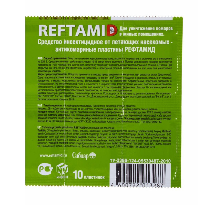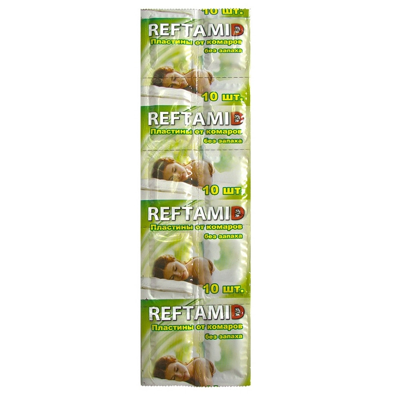 Средство от насекомых Reftamid от комаров пластины 10 г (10 штук в упаковке) Назначение: Эффективное инсектицидное средство для уничтожения комаров в жилых помещениях. Представляет собой небольшие картонные полоски-таблетки к электрофумигатору, пропитанные раствором, отпугивающим насекомых. Начало действия средства примерно через 10-15 минут после включения электроприбора в сеть на 220 В. Преимущества: можно оставлять на всю ночь (при открытых окнах), одна пластина эффективна на площади до 13 кв. метров, безопасны для здоровья людей и домашних животных. Способ применения: Вынуть из упаквки картонную пластинку, вложить в нагреватель и включить его в электросеть на 220 В. Средство начинает действовать через 10-15 минут после включения. Полное уничтожение комаров достигается примерно за 1 час. Нагреватель выключают, пластинку сохраняют для последующего использования в течение 7-8 часов. При открытых на ночь окнах или форточках нагреватель с пластинкой оставьте включенным на всю ночь для уничтожения залетающих комаров. Меры предосторожности: Средство применять в хорошо проветриваемых помещениях, при открытых окнах (форточках). Одну пластинку использовать в помещении площадью не менее 13 м2. Хранить средство в упаковке, отдельно от пищевых продуктах, в местах недоступных детям. Использовать только по назначению! Отработанные пластинки выбросить в мусоросборник. Состав: Эсбиотрин, растворитель, стабилизатор, краситель. Срок годности: 4 года со дня изготовления..