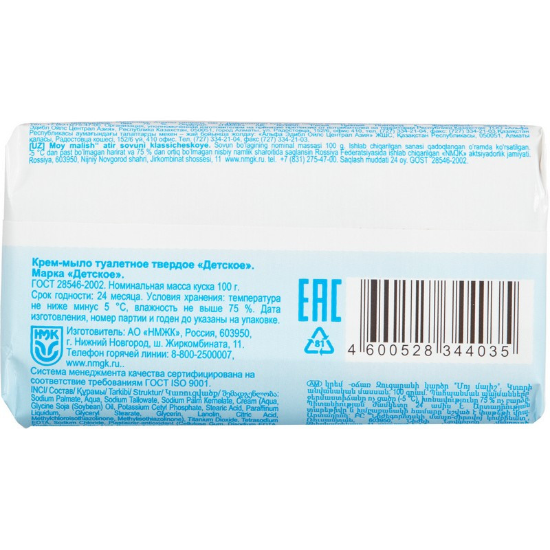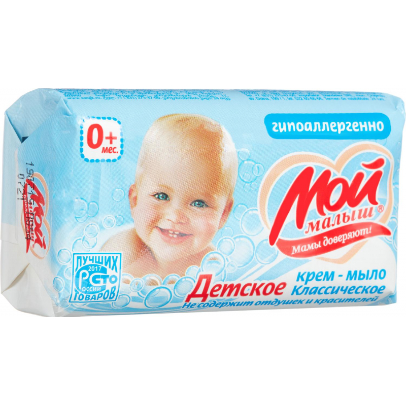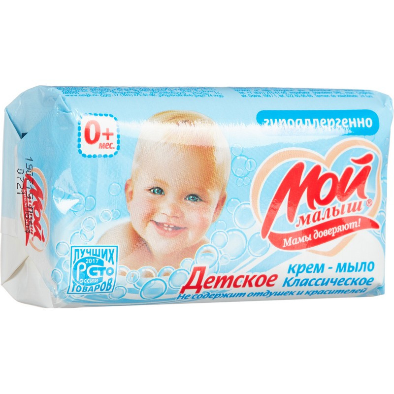 Крем-мыло туалетное Мой Малыш классическое 100 г Крем - мыло туалетное твердое 'Детское' предназначено для ухода за нежной детской кожей с первых дней жизни. Обеспечивает бережный уход и подходит для ухода за кожей самых чувствительных малышей, склонных к аллергическим реакциям. Не содержит красителей и отдушек. Способ применения: нанесите необходимое количество мыла на влажную кожу. Массируйте до появления пены, затем смойте теплой водой. Меры предосторожности: используйте только для мытья тела. Не используйте при наличии ран, воспаления и раздражения кожи. При появлении покраснения кожи, раздражения, зуда, опухания и других симптомов прекратите использование. При попадании в глаза обильно промойте чистой водой. Хранить в недоступном для детей месте. Состав: Sodium Palmate, Aqua, Sodium Tallowate, Sodium Palm Кernelate, Cream (Aqua, Glycine Soja (Soybean) Oil, Potassium Cetyl Phosphate, Stearic Acid, Paraffinum Liquidum, Glyceryl Stearate, Glycerin, Lanolin, Citric Acid, Methylchloroisothiazolinone, Methylisothiazolinone), Titanium Dioxide, Tetrasodium EDTA, Sodium Chloride, Cellulose Gum, Disodium EDTA, Triethanolamine, Citric Acid, Boric Acid, Benzoic Acid, Polyethylene Glycol-400, Glycerol. Условия хранения: Хранить при температуре не ниже -5 °C и относительной влажности не выше 85%. Срок годности: 36 месяцев