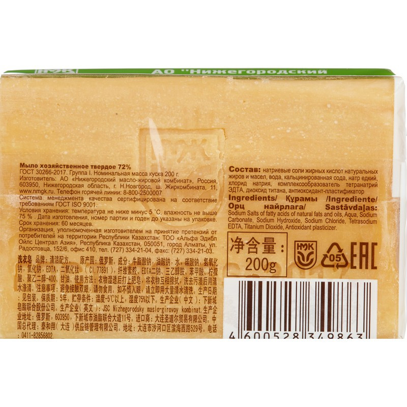 Мыло хозяйственное 72% 200 г (НМЖК). Хозяйственное мыло предназначено для стирки белых и цветных материалов, замачивания белья, мытья полов и ковровых покрытий, выведения пятен и дезинфекции очищаемых поверхностей. Качественно стирает в холодной и горячей воде. Способ применения: намылить или вспенить до густой пены и использовать по назначению (стирка, санитарно-гигиенические, промышленные цели). Меры предосторожности: при попадании мыльной пены в глаза промыть их чистой водой, при попадании в рот - прополоскать водой. Состав: натриевые соли жирных кислот натуральных жиров и масел, вода, кальцинированная сода, натр едкий, хлорид натрия, комплексообразователь тетранатрий ЭДТА, диоксид титана, антиоксидант-пластификатор. Условия хранения: хранить при температуре не ниже минус 5 °С и влажности не более 75%. Срок годности: 60 месяцев.