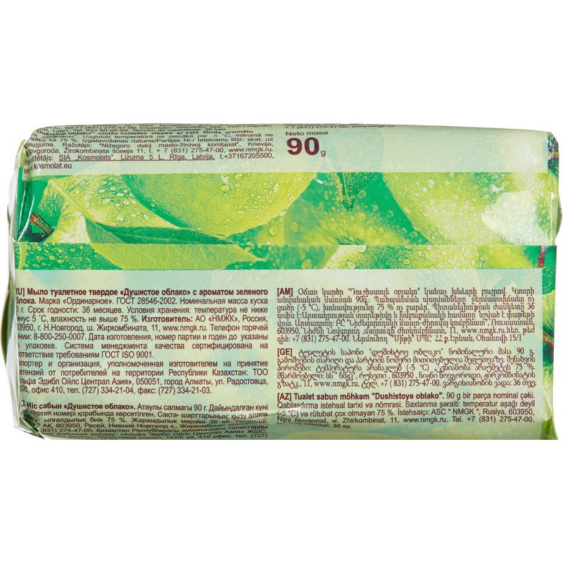 Мыло туалетное Душистое облако с ароматом зеленого яблока 90 г Мыло ?Душистое облако? изготовлено из высококачественного сырья и не имеет посторонних запахов, кроме очаровательного аромата зелёного яблока. Средство увлажняет и не раздражает даже самые чувствительные участки тела. Мыло мягко, но эффективно очищает кожу, не травмирует и не сушит её. Способ применения: нанесите необходимое количество мыла на влажную кожу. Массируйте до появления пены, затем смойте теплой водой. Меры предосторожности: используйте только для мытья тела. Не используйте при наличии ран, воспаления и раздражения кожи. При появлении покраснения кожи, раздражения, зуда, опухания и других симптомов прекратите использование. При попадании в глаза обильно промойте чистой водой. Хранить в недоступном для детей месте. Состав: Sodium Palmate, Aqua, Sodium Tallowate, Sodium Palm Кernelate, Parfum, Titanium Dioxide, Tetrasodium EDTA, Sodium Chloride, Coumarin. Условия хранения: Хранить при температуре не ниже -5 °C и влажности не выше 75%. Срок годности: 36 месяцев