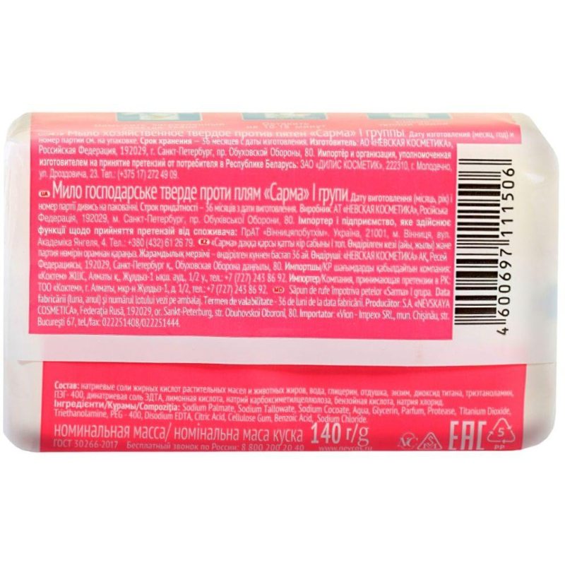 Мыло хозяйственное Sarma против пятен 140 г Является высокоэффективным средством для стирки и уборки, обеспечивает высокое пенообразование даже в жесткой и холодной воде. Содержит оптический отбеливатель и глицерин. Легкая стирка, в 2 раза меньше усилий. Глицерин защищает кожу от потери естественной влаги, обеспечивает смягчение и увлажнение, энзим используется для удаления пятен белкового характера с ткани. Способ применения: намылить или вспенить до густой пены и использовать по назначению (стирка, санитарно-гигиенические, промышленные цели) Меры предосторожности: при попадании мыльной пены в глаза промыть их чистой водой, при попадании в рот - прополоскать водой Состав: Sodium Palmate, Sodium Tallowate, Sodium Cocoate, Aqua, Glycerin, Parfum, Protease, Titanium Dioxide, Triethanolamine, PEG-400, Disodium EDTA, Citric Acid, Cellulose Gum, Benzoic Acid, Sodium Chloride. Условия хранения: хранить при температуре не ниже минус 5°С и влажности не более 75% Срок годности: 36 месяцев