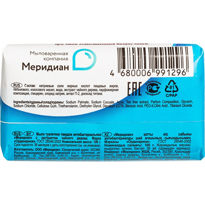 Мыло туалетное Меридиан Антибактериальное с экстрактом чайного дерева 100 г Прекрасно сочетает в себе хорошие моющие и гигиенические свойства с благоприятным воздействием на кожу. Экстакт чайного дерева тонизирует, очищает и освежает кожу не пересушивая деликатные и чувствительные ткани. Состав: натриевые соли жирных кислот пищевых жиров, пальмового, кокосового масел, вода, экстракт чайного дерева, парфюмерная композиция, глицерин, хлорид натрия, антал П-2, диоксид титана. Условия хранения: хранить при температуре не ниже минус 5°С и влажности не более 75% Срок годности: 36 месяцев. Относится к сегменту "суперэконом" - товар с минимальными требованиями к качеству для тех, кто хочет сэкономить. Законодательные и технические документы