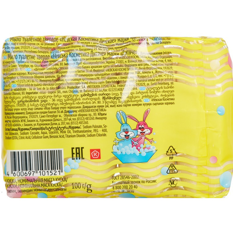 Мыло туалетное Детское 4 штуки по 100 г Самое нежное и нейтральное мыло для ухода за детской кожей. Не вызывает аллергии, не содержит парфюмерных добавок и красителей. Изготовлено из натурального сырья высочайшего качества. Подходит для детей и взрослых с чувствительной кожей. Способ применения: нанесите необходимое количество мыла на влажную кожу. Массируйте до появления пены, затем смойте теплой водой. Меры предосторожности: при попадании мыльной пены в глаза промыть их чистой водой, при попадании в рот - прополоскать водой Состав: Sodium Palmate, Sodium Tallowate, Sodium Cocoate, Aqua, Glycerin, Mink Oil, Triethanolamine, PEG-400, Disodium EDTA, Citric Acid, Cellulose Gum, Benzoic Acid, Titanium Dioxide, Sodium Chloride. Условия хранения: Хранить при температуре от 0 °C до +25 °C. Срок годности: 24 месяца Законодательные и технические документы