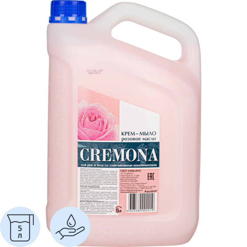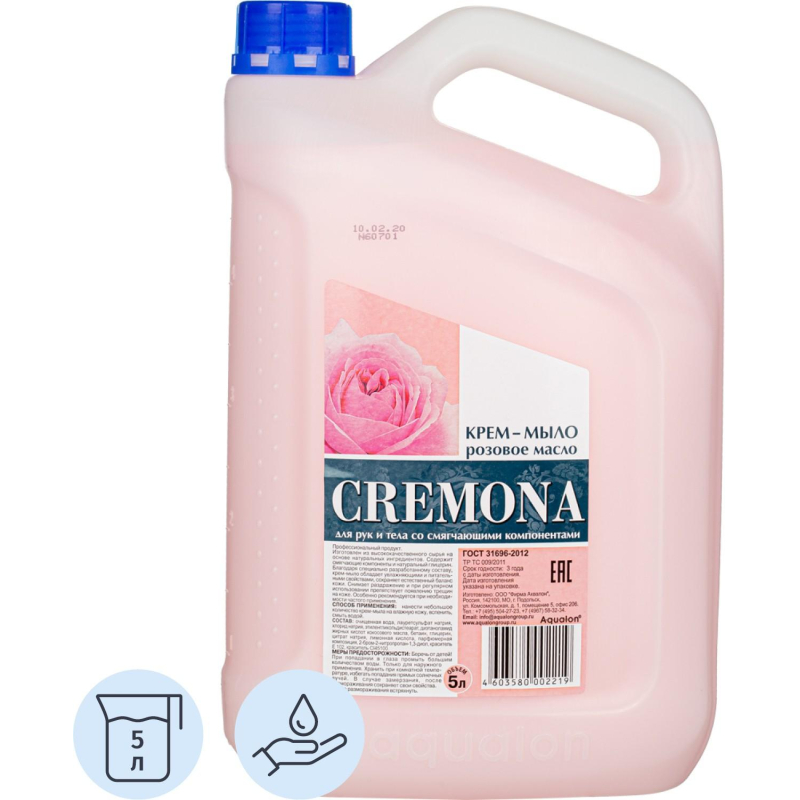 Мыло жидкое Кремона Розовое масло 5 л. Назначение: для мытья рук и тела Способ применения: нанести небольшое количество мыла на влажную кожу, вспенить, смыть водой. Меры предосторожности: только для наружного применения. Беречь от детей. При попадании в глаза промыть большим количеством воды. При случайном употреблении внутрь немедленно обратиться к врачу, показав упаковку и этикетку. Состав: очищенная вода, лауретсульфат натрия (5-10%), хлорид натрия (< 5%), этиленгликольдистеарат (< 5%), диэтаноламид жирных кислот кокосового масла (< 5%), бетаин (< 5%), глицерин (< 5%), цитрат натрия (< 5%), лимонная кислота (< 5%), парфюмерная композиция (< 1%), 2-бром-2-нитропропан-1.3-диол (< 1%), красители (< 1%). Условия хранения: хранить при комнатной температуре, избегать попадания прямых солнечных лучей. В случае замерзания после размораживания сохраняет свои свойства. После размораживания встряхнуть. Срок годности 3 года.<!--noindex-->Внешний вид и/или характеристики товара могут быть изменены производителем в соответствии с производственным процессом.<!--/noindex-->
