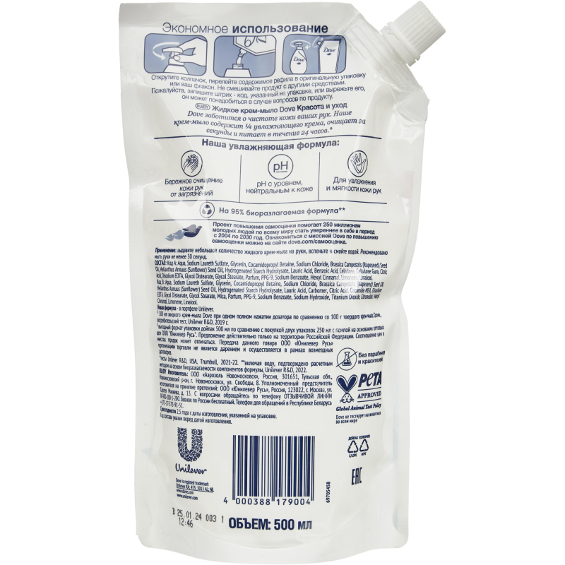 Крем-мыло Dove 500 мл. Средство от Dove подарит коже рук ощущение комфорта и увлажненности. Нет ничего лучше, чем мягкая и увлажненная кожа, и она может быть именно такой каждый день благодаря правильно подобранным косметическим средствам. Благодаря жидкому крем-мылу Dove Красота и уход с эффективно очищающей формулой, на 1/4 состоящей из увлажняющего крема, Ваша кожа становится более нежной, гладкой и красивой. Используйте каждый день для ощущения комфорта. Жидкое Крем-мыло Dove Красота и уход помогает коже сохранять естественный водный баланс, оставаться мягкой и гладкой. Выберите жидкое крем-мыло Dove для очищения и увлажнения кожи, чтобы преобразить Ваши ежедневные процедуры по уходу за собой и насладиться красотой и мягкостью своей кожи. Жидкое крем-мыло Dove - это мягкое очищающее средство, которое сокращает вероятность появления раздражения или сухости кожи рук, поэтому оно станет является идеальным дополнением к косметическим средствам, которыми Вы пользуетесь ежедневно. Когда мы отлично выглядим и хорошо себя чувствуем, мы становимся счастливее. Dove реализует программу по повышению самооценки среди молодого поколения. Состав продукта: Aqua, Sodium Laureth Sulfate, Glycerin, Cocamidopropyl Betaine, Sodium Chloride, Lactic Acid, Citric Acid, Glycol Distearate, Laureth-4, Parfum, PPG-6, Sodium Benzoate, Tetrasodium EDTA, Hexyl Cinnamal, Limonene, Linalool. Цвет продукта: прозрачный. Текстура продукта: прозрачная. <!--noindex-->Внешний вид и/или характеристики товара могут быть изменены производителем в соответствии с производственным процессом.<!--/noindex-->